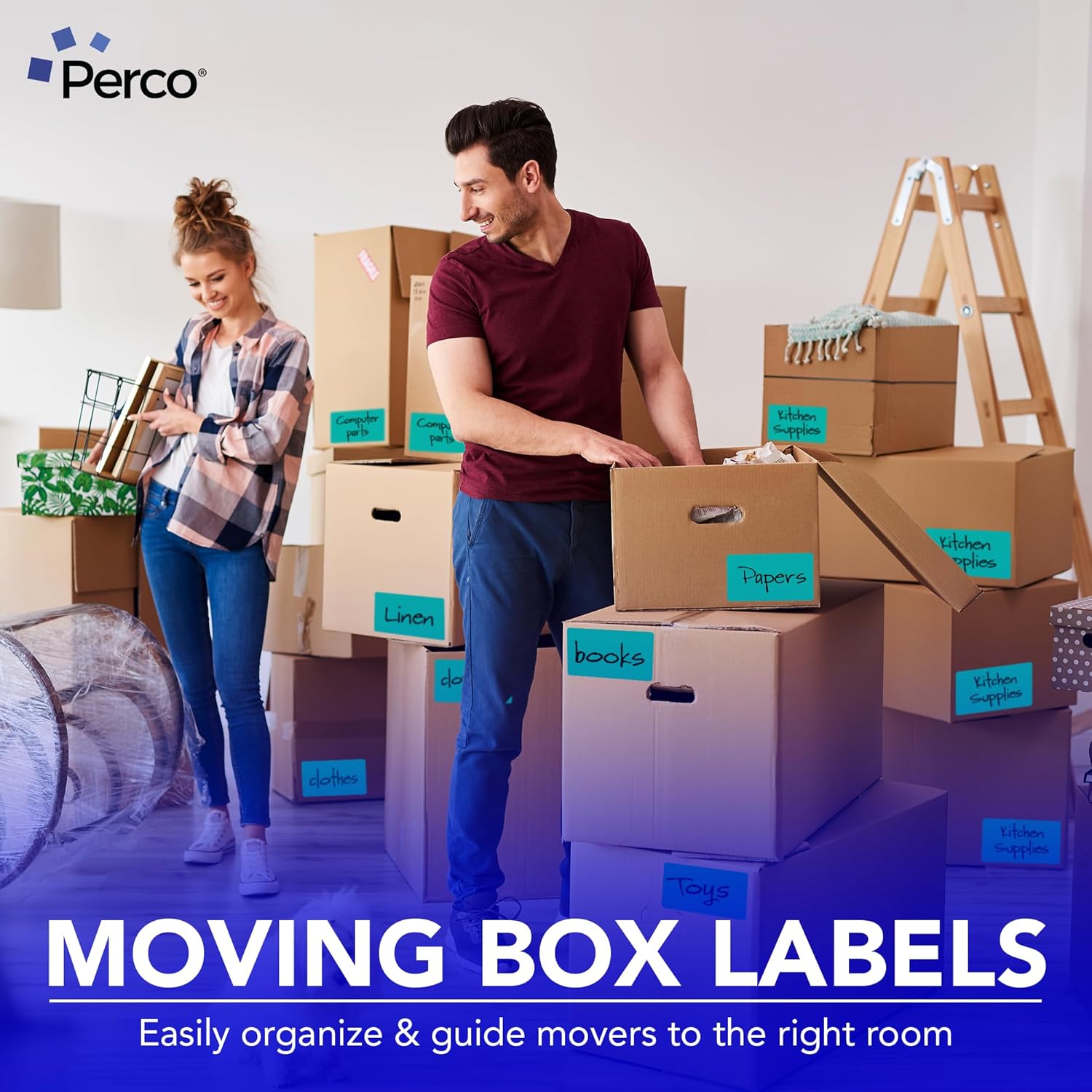 Perco Teal Labels 3x5 Inch 500 Stickers/Roll with Easy Peel Perforation and Strong Adhesion for Inventory Management, Color Coding, Moving Boxes, Retail, Organizing & Crafts – Made in USA