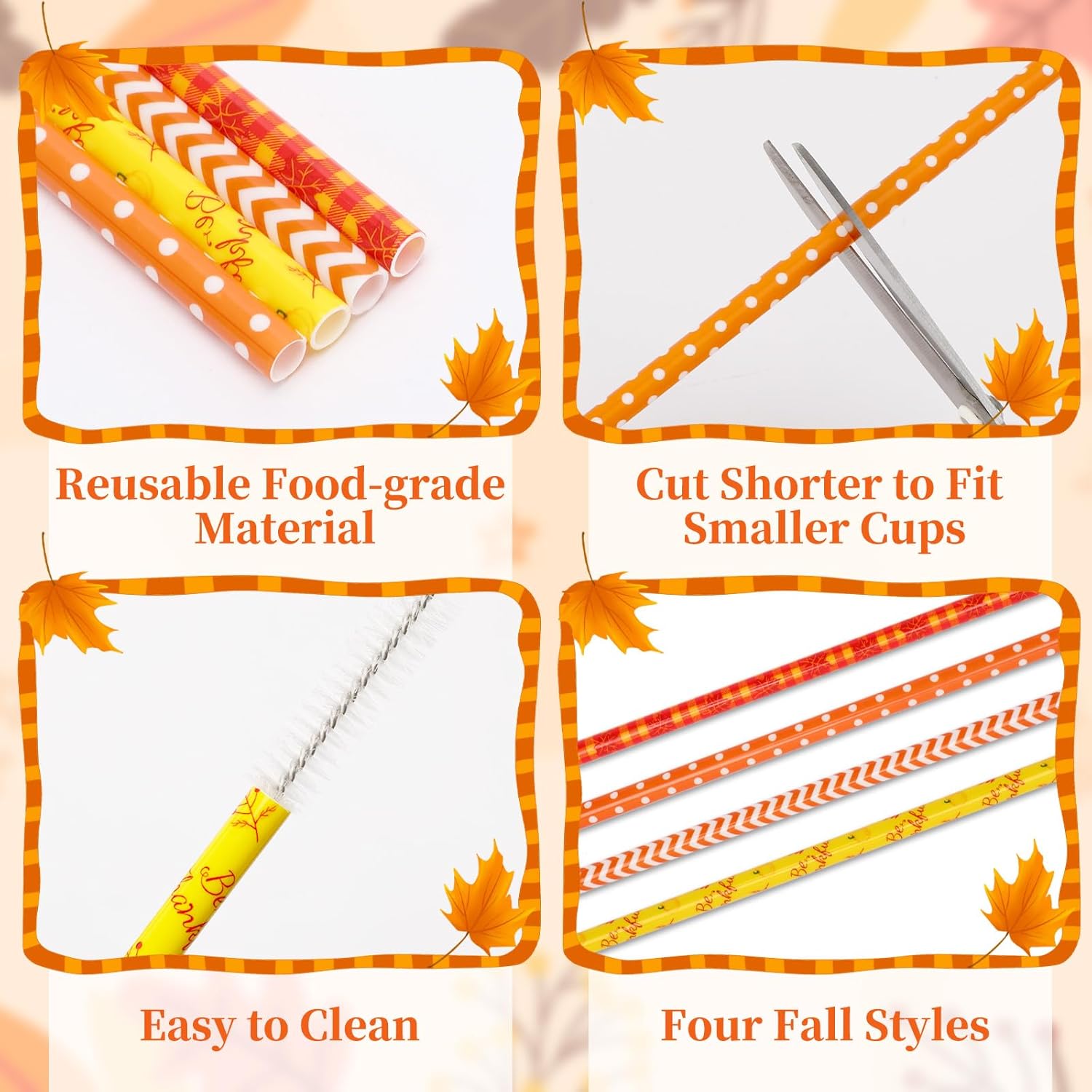 - 【Fall Themed Design】Our Thanksgiving reusable straws feature 4 different classic fall elements, such as maple leaf, pumpkin, wheat, and Happy Autumn, which ideally fit the Thanksgiving atmosphere