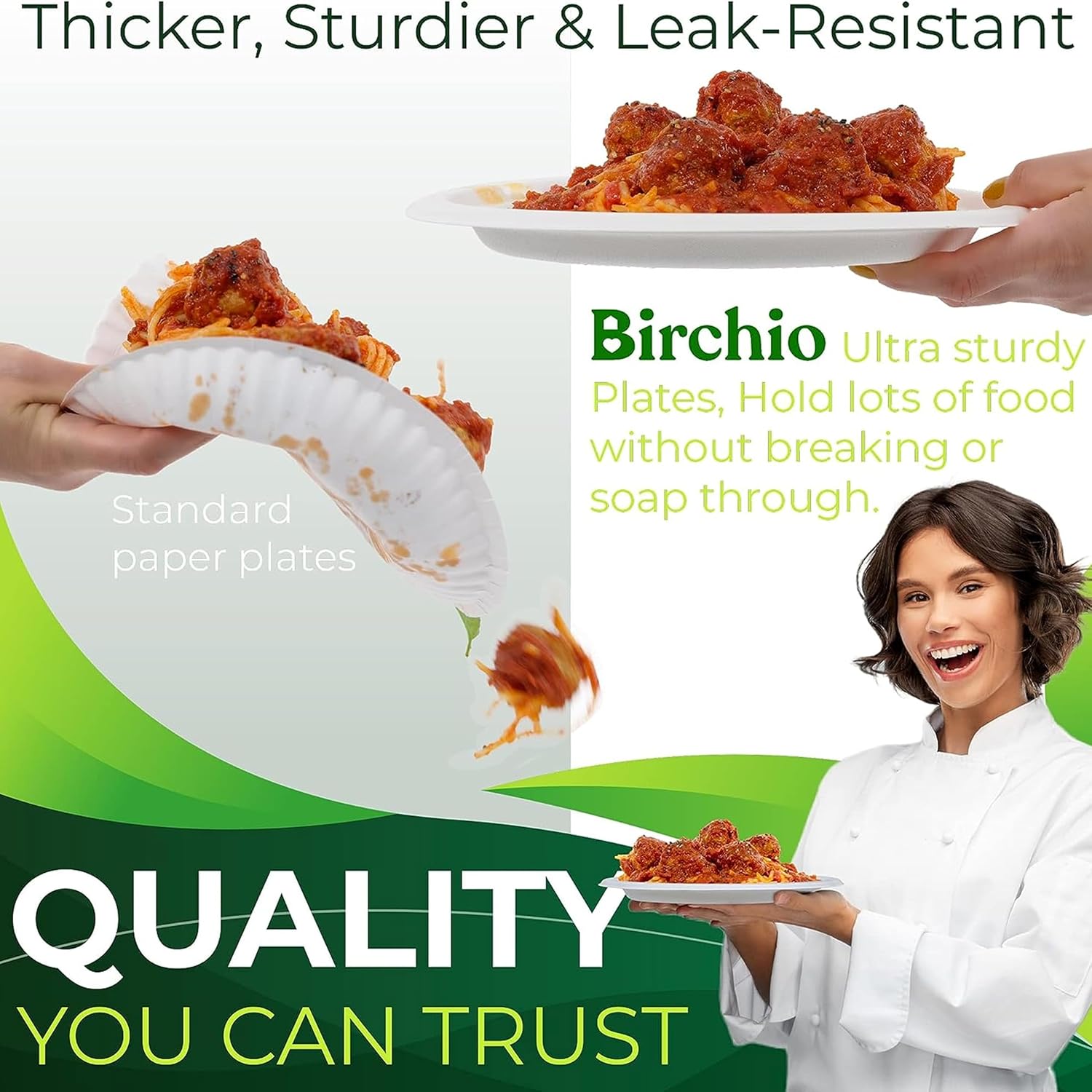 - 🌿 【Thicker, Sturdier & Leak-Resistant】- Our unique process mixed Bamboo and Bagasse to create heavy-duty compostable plates you will love! Bamboo has natural strength and liquid resistant characteristics that help provide superior strength and reduce unnecessary leaks. They can even handle the messiest food items thanks to the oil proof design. The wide rim design allows you to serve saucy foods on the plate without worrying about spills and messes.