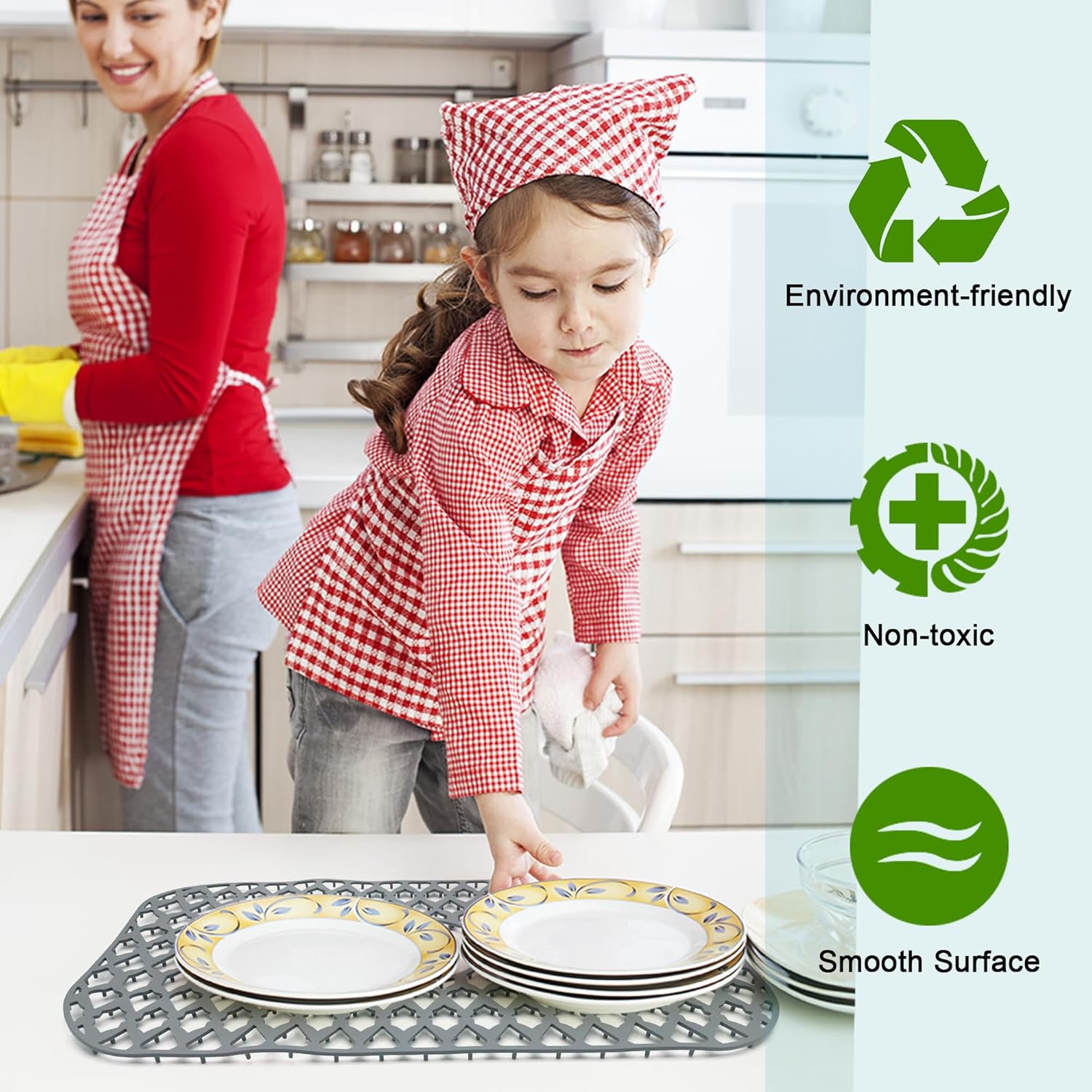 - Heat Resistant & Elastic Silicone Material - Because of the high melting point of silicone material, Our kitchen sink mats can be used to hold high-temperature tableware. Of course, the soft silicone material can form effective protection for bottom of the kitchen sink and table surface, especially when children use tableware, which can prevent many accidents.