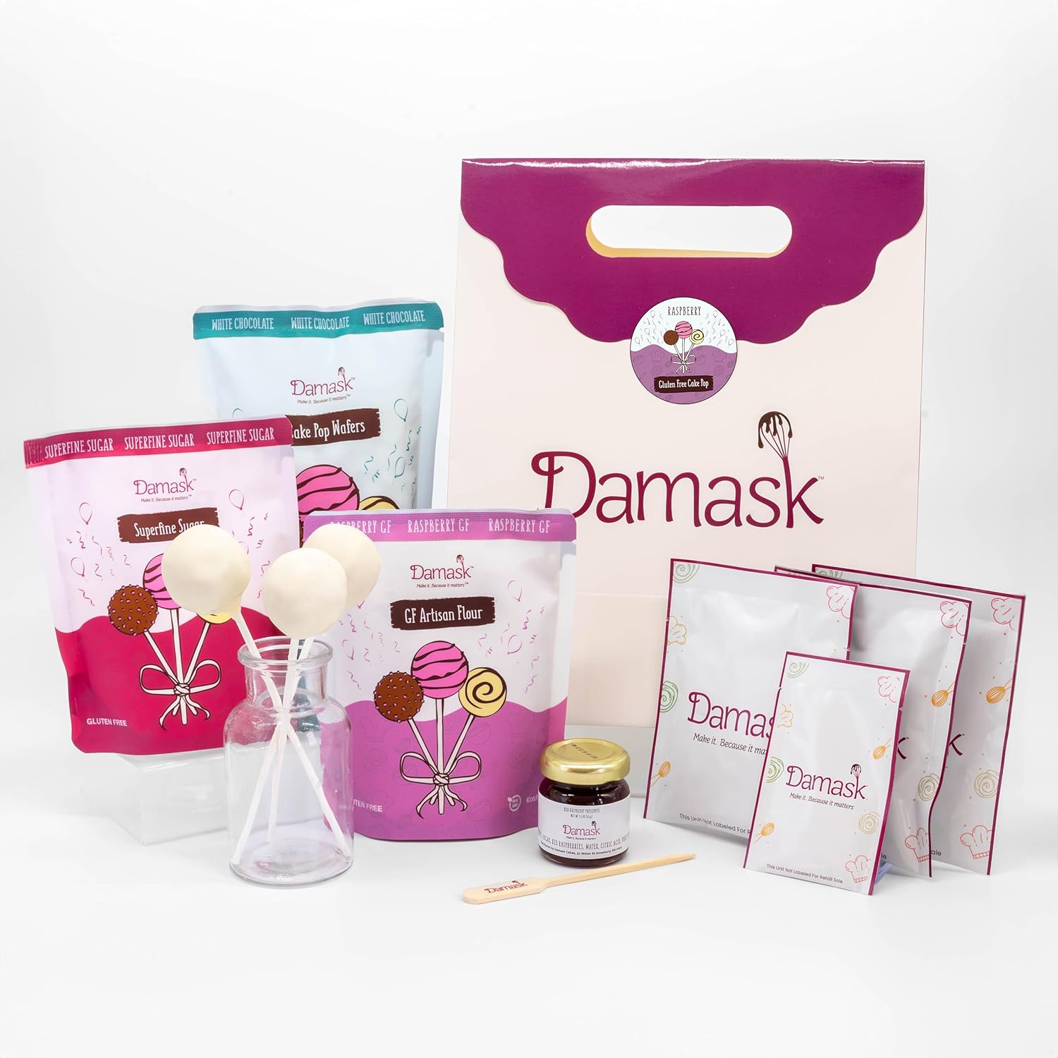 - KIT INCLUDES: Gluten Free Artisan flour, superfine sugar, red raspberry extract, red raspberry preserves, Madagascar vanilla extract, whole milk powder, organic oil, gourmet chocolate candy coating, small-batch, naturally-colored rainbow sprinkles, 20 cake pop sticks, 20 cellophane wraps & ties, 1 parchment round, 1 skewer (to test doneness)