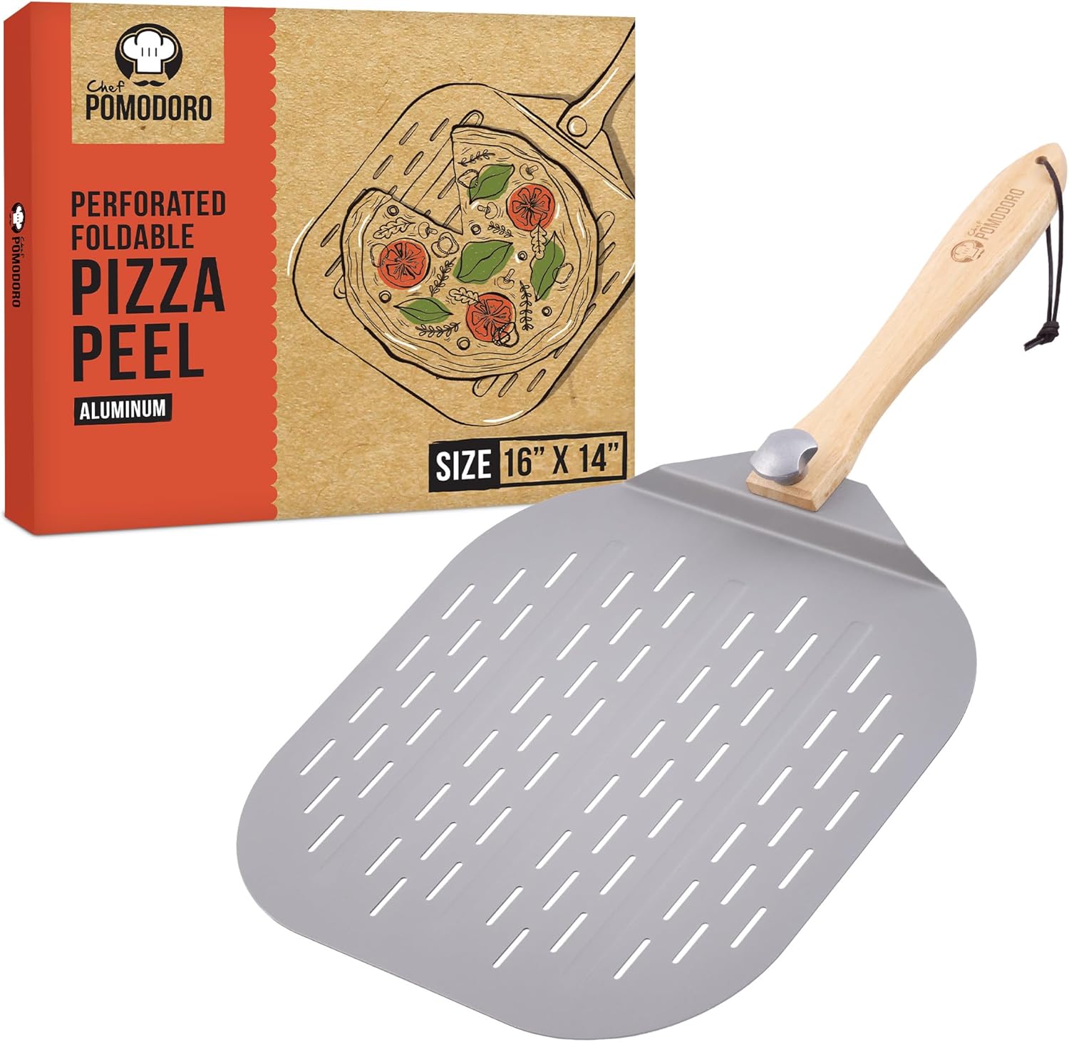 Chef Pomodoro Aluminum Metal Pizza Peel with Foldable Wood Handle for Easy Storage, Pizza Spatula, Gourmet Luxury Pizza Paddle for Baking Homemade Pizza Bread (16 inch)