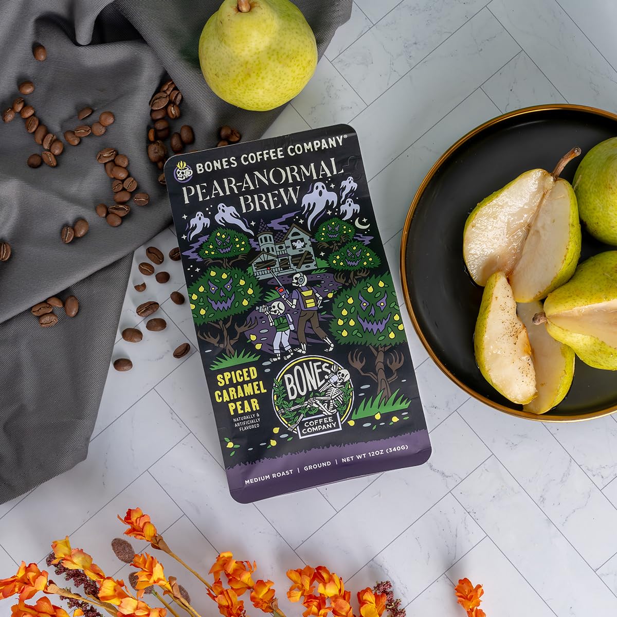 Bones Coffee Company Pear-Anormal, Caramel and Spiced Pear Flavored Coffee, Medium Roast Low Acid Arabica Beans Compatible with Auto drip and French Press Coffee Maker, 12 Oz Whole Bean