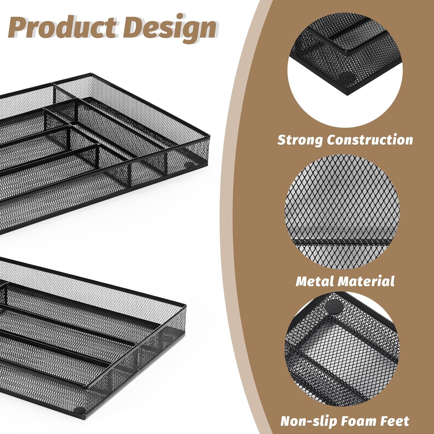 Silverware Organizer Metal Mesh, Large Drawer Organizer, Utensil Cutlery Tray for kitchen drawers, Flatware Organizer with 6 Compartment, Black (11.3”*16“)