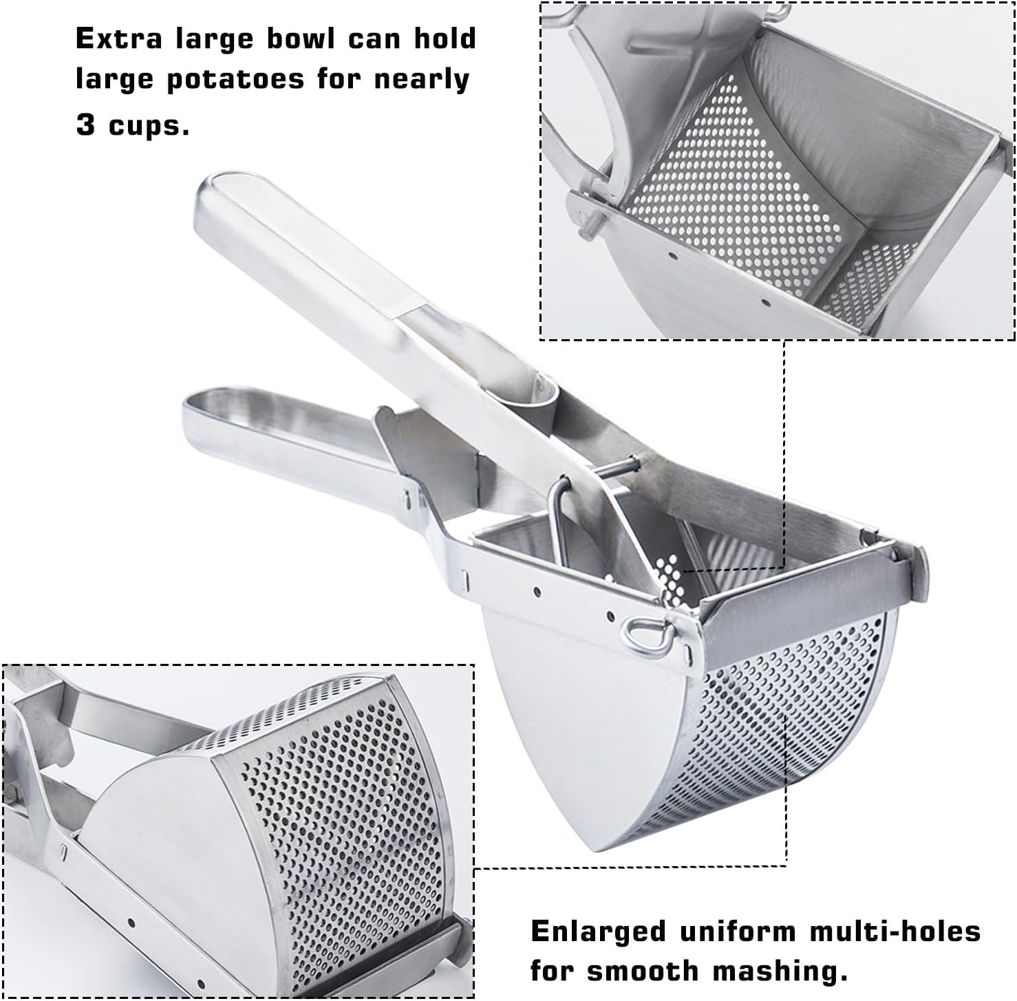 - Large Capacity: The large bowl can hold nearly 3 cups of large potatoes, you can easily put them in and press the handle simply, here comes the fluffy and creamy mashed potatoes!