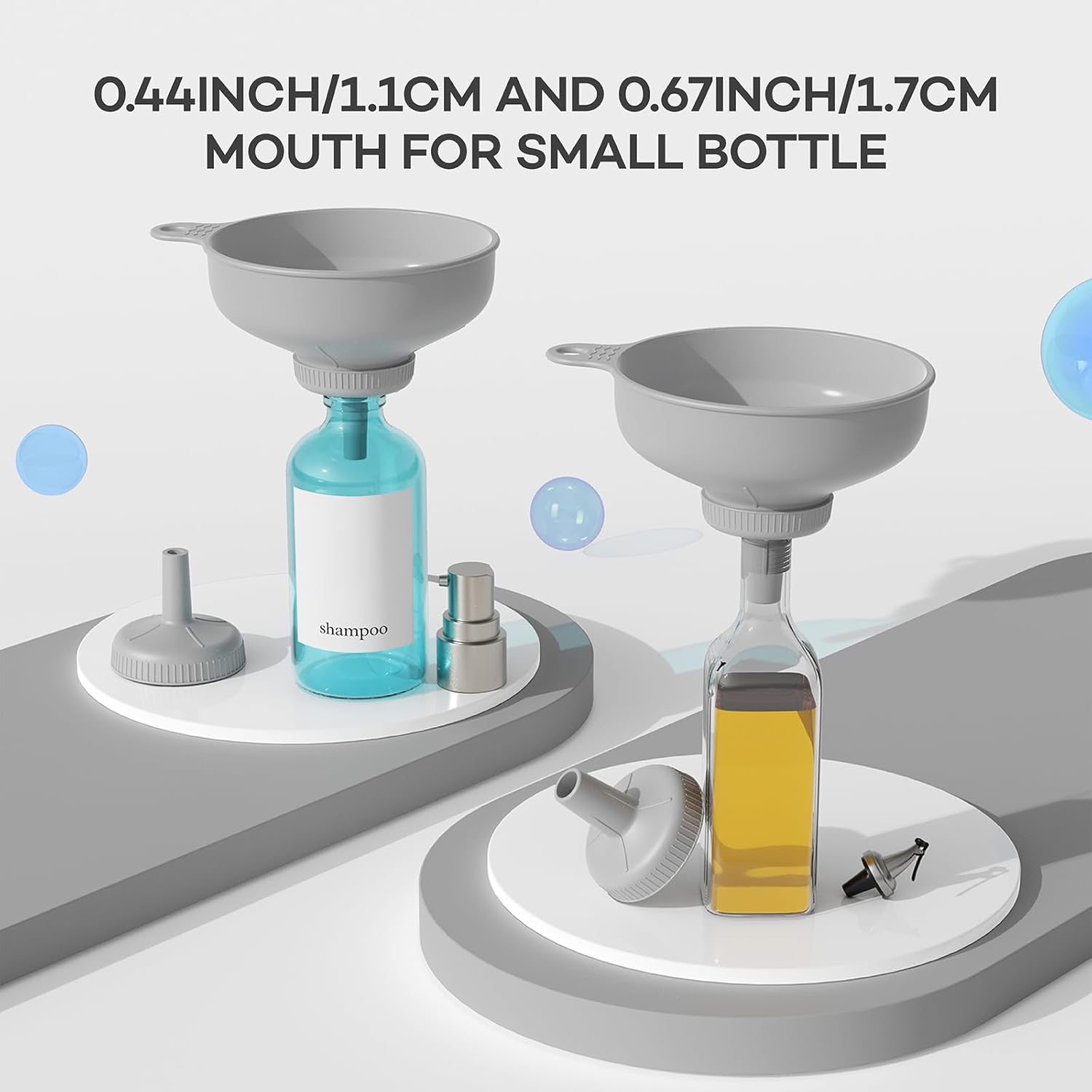 - Detachable and Rotating Screw Design: Just rotating the spout you can get a different mouth funnel(1.1 cm, 1.7 cm, 2.36 cm, 3.35 cm, 5 cm), allowing you to fill any food, cosmetic or particles into different sizes bottles