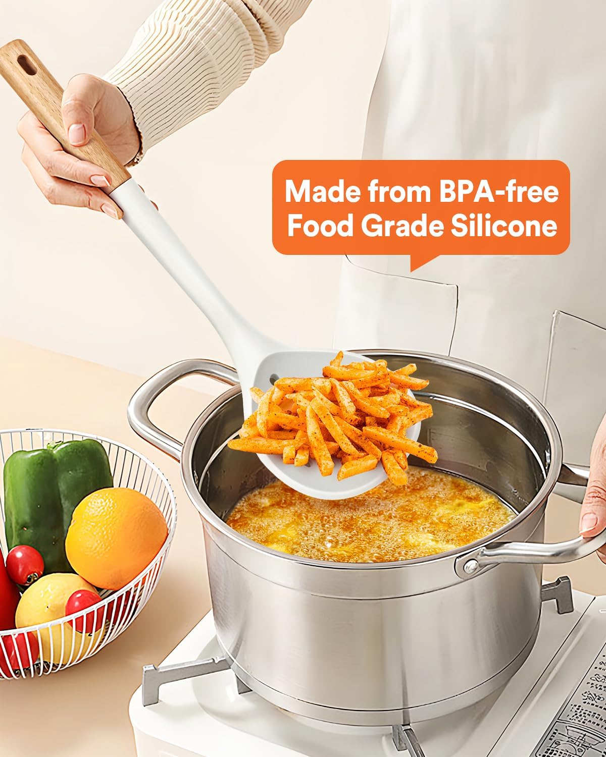 - More Safe And Healthy: Our kitchen ladle strainers are made of food-grade silicone, free of BPA. Even at high temperatures of 446℉ (230℃), there is no need to worry about melting or deforming. At the same time, the soft silicone won't scratch the coating, which can better protect your pot