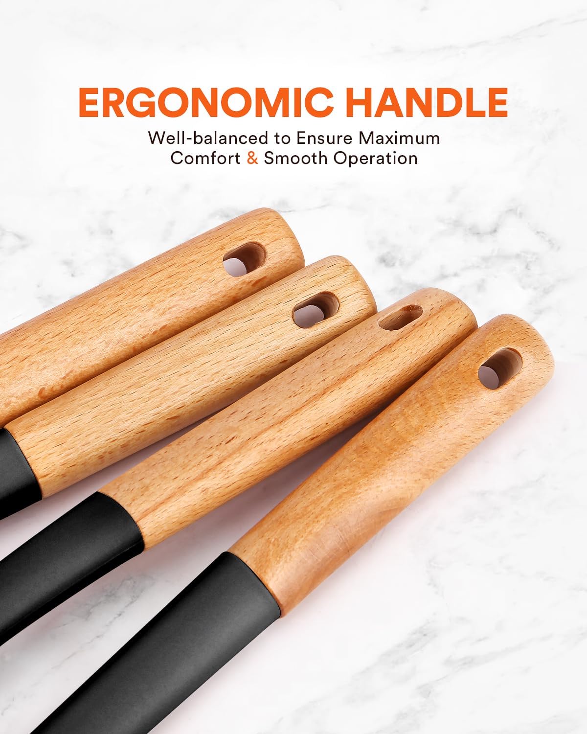 - The Most Thoughtful Design: The high-quality nylon core is more durable and keeps you away from the trouble of kitchen utensils rusting or breaking. The anti-scald Wooden handle is not easy to conduct heat and is more comfortable to hold than traditional utensils