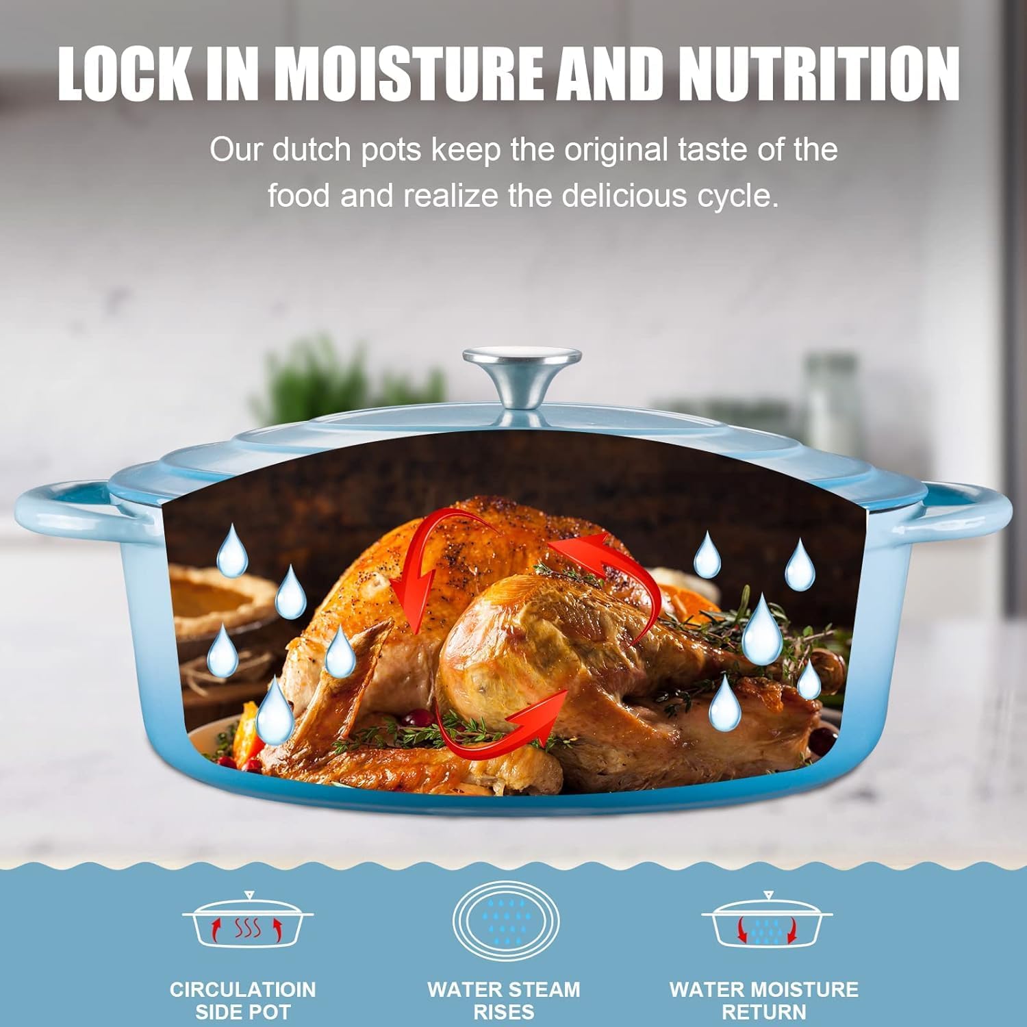 Enameled Cast Iron Oval Dutch Oven, 7 qt Oval Dutch Oven Pot with Lid and Dual Handles for Braising, for Braising, Broiling, Bread Baking, Frying, Light Blue
