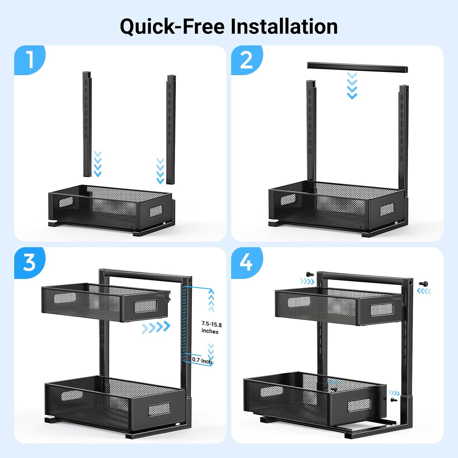 - Steel Design, Strong And Sturdy: This organizer features a reinforced mesh frame made of thickened steel and seamlessly welded to withstand 60LB loads. Durability is superior to warped plastic rails, and its sturdy counterweight design prevents wobbling, making it the perfect kitchen cabinet organizer for heavy-duty and long-term storage use.