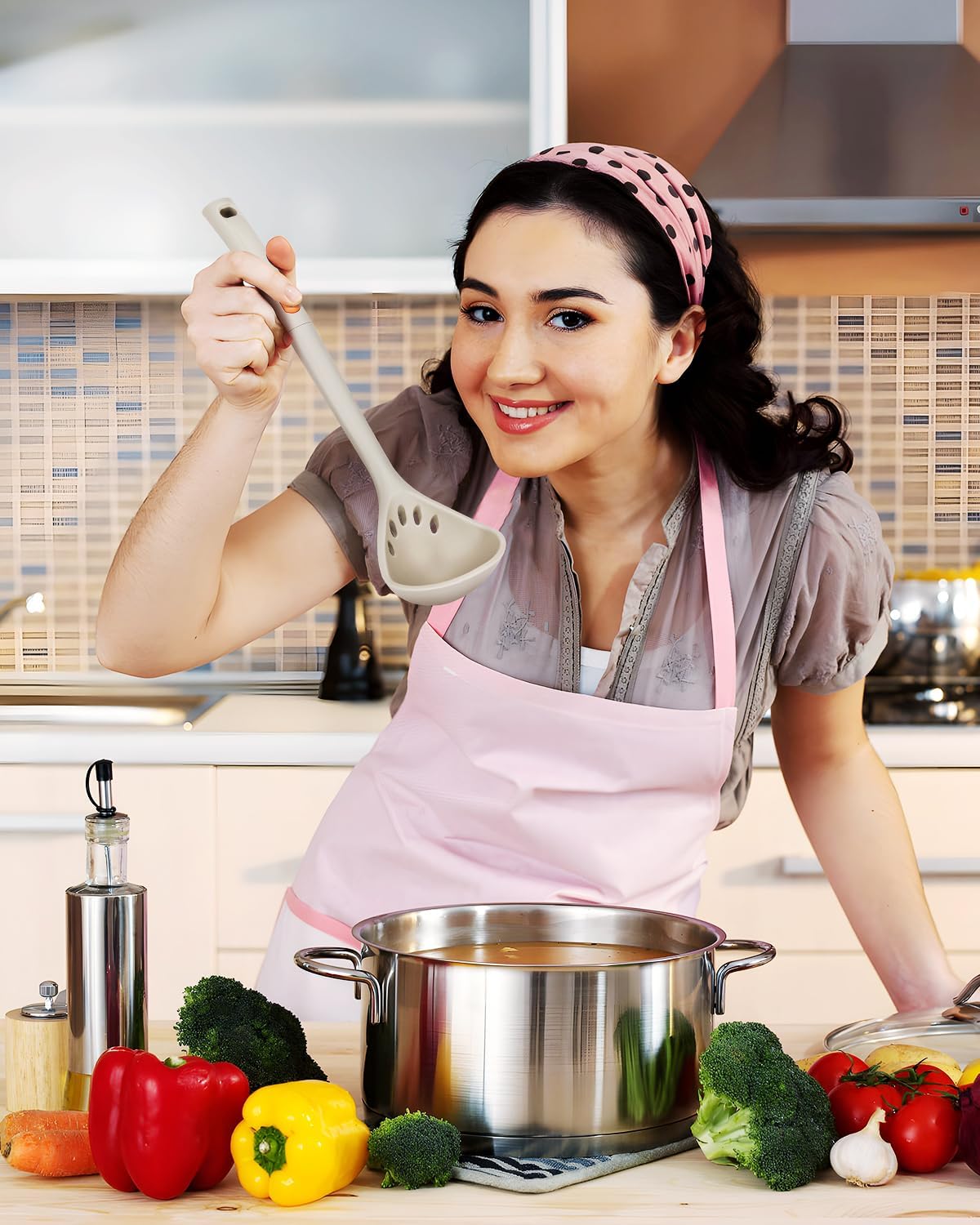 Silicone Pasta Fork and Ladle Spoon Set, Large Non Stick Kitchen Utensils for Cooking,Stirring,One Piece Serving Spaghetti, Soup, Sauce (KHAKI)