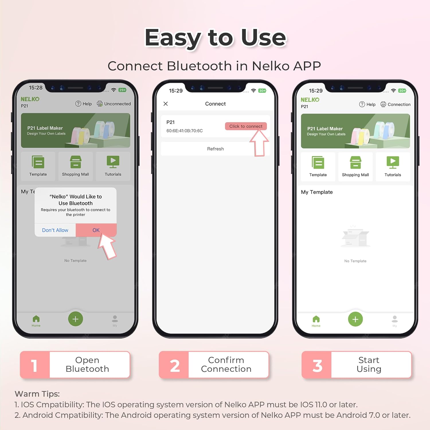 - Easy to Use: NELKO label printer compatible with IOS & Android Phone via bluetooth connection. Step 1: Download "Nelko" APP from Google Play or App Store. Step 2: Install the paper roll. Step 3: Connect the P21 bluetooth within APP. Step 4: Choose a quick template and start printing. It is not compatible with Google phones on Android 14. This label maker machine with tape APP included more than 90 +Fonts, 10+ Languages, 450+ Materials. (Note: This label maker doesn't work with computers)