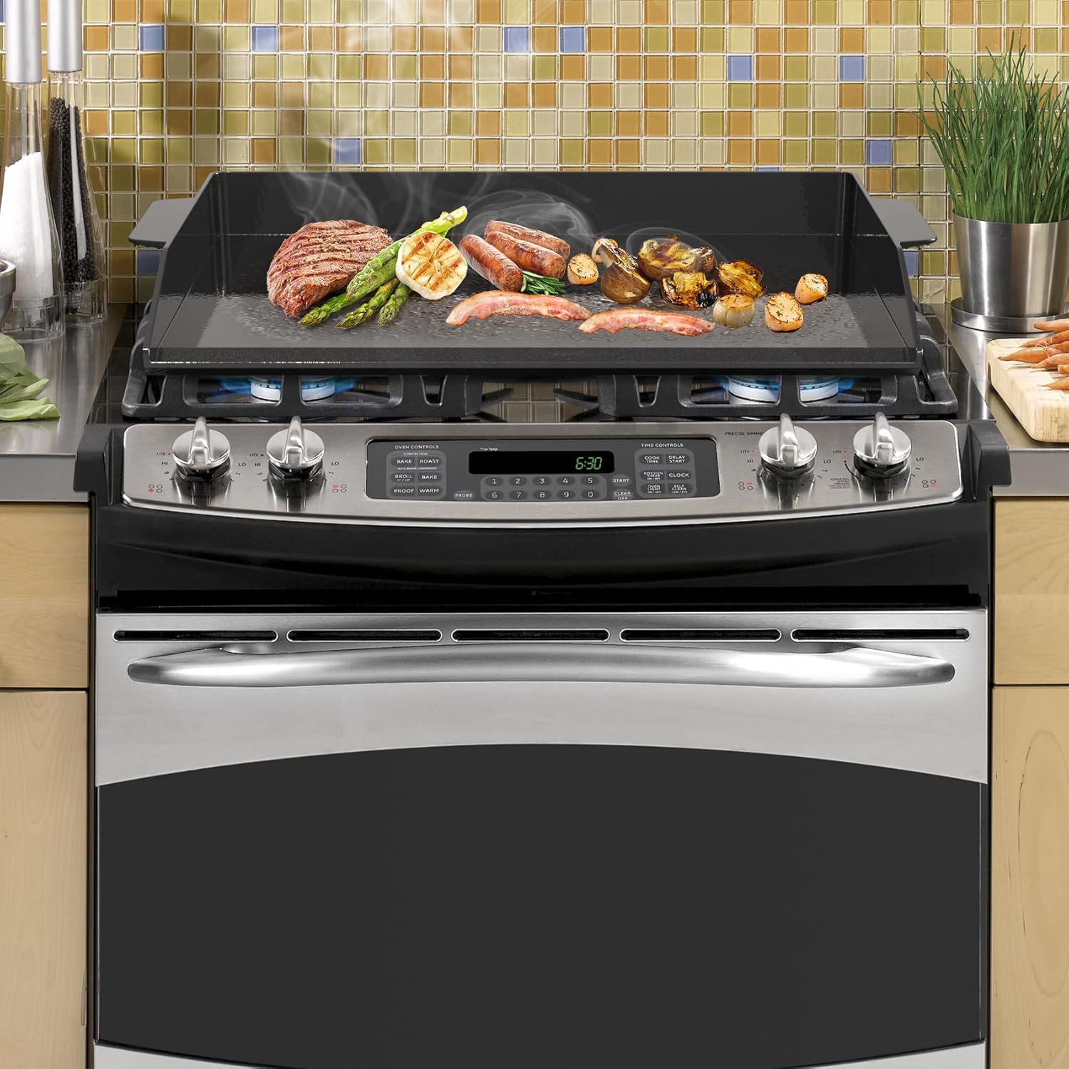- Dimension: 23" LΓ16" WΓ2.6" H, fit virtually any grill and 4 burner range oven and turn your grill into an outdoor kitchen for all-around cooking, it's the perfect outdoor cooker, you can cook pancakes, bacon, sandwich, eggs, salmon, grilled cheese, and chicken, burgers, sausages, vegetables, and so on.