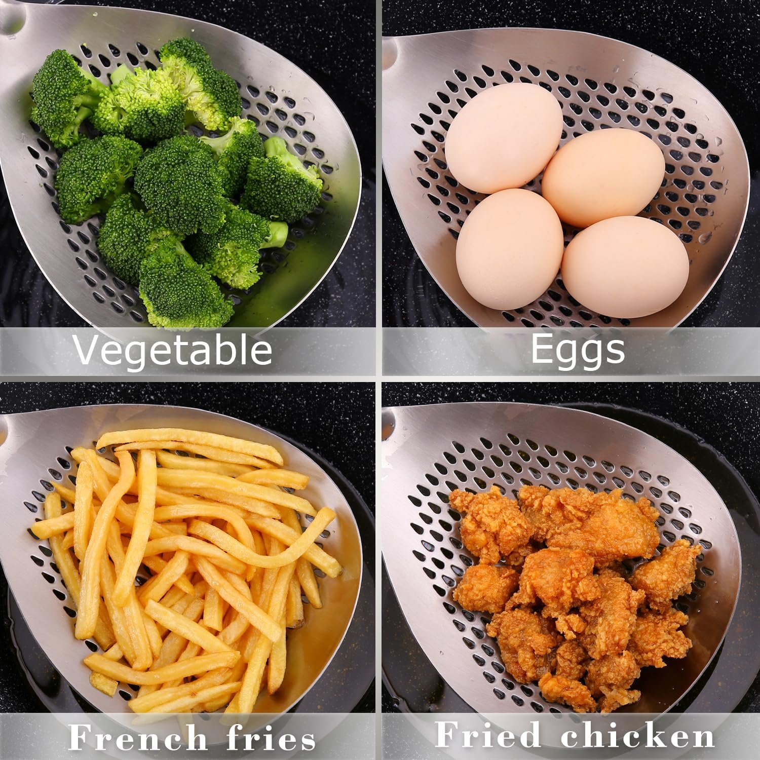 - PERFECT FOR DEEP FRYING: Our skimmer spoon is a great helper in the kitchen when you need a fryer scoop for frying crisps, fried chicken, scooping up pasta, broccoli, wontons, or eggs. The strainer with a handle features an 8.7-inch wooden handle, allowing you to step away from the hot oil without risking burns