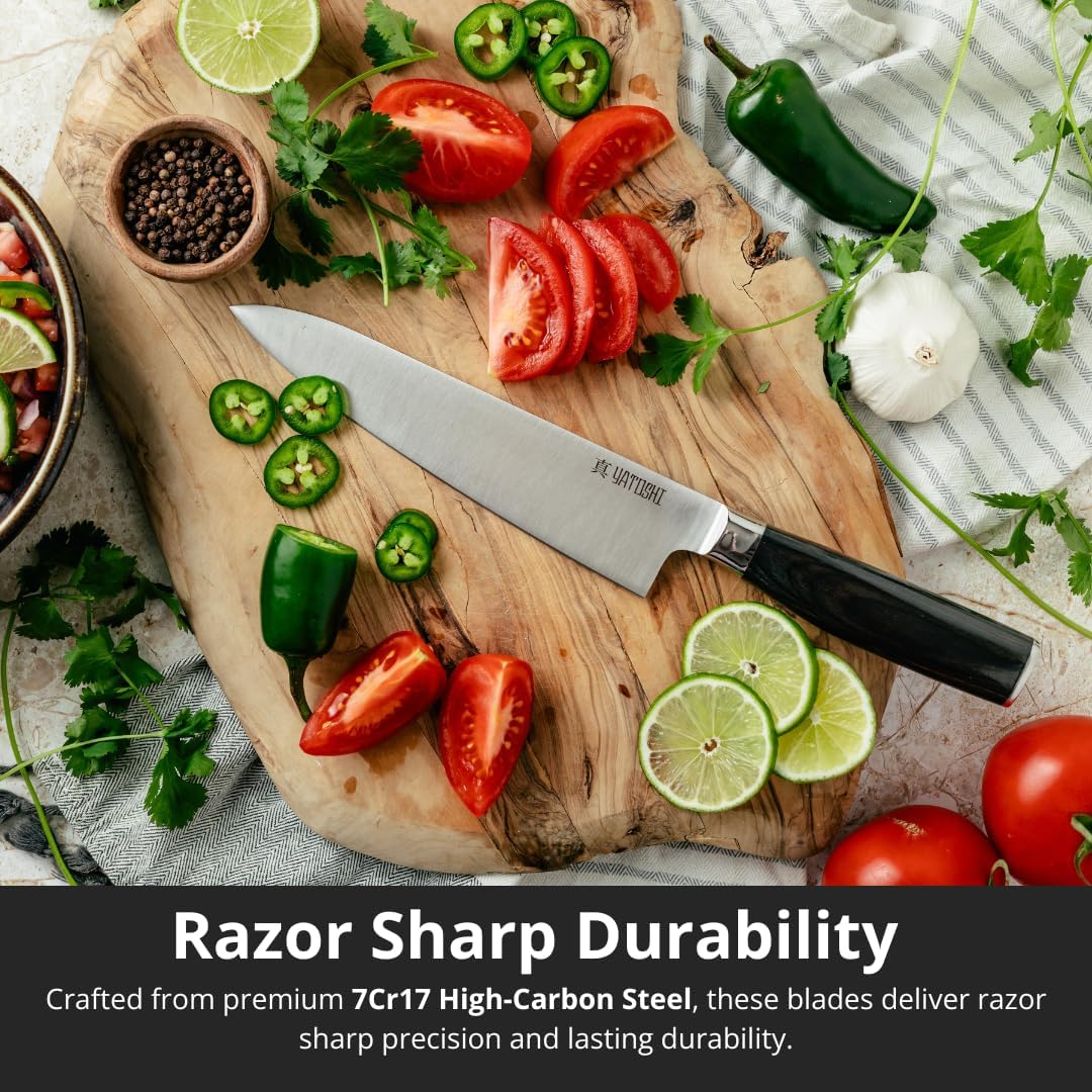 - High Carbon Blades: Made with premium 7Cr17 High Carbon Steel that provides a razor-sharp professional quality blade. The steel contains 0.6-0.75 carbon, making it two times tougher than other knives in its class with a Rockwell Hardness of 57-58.