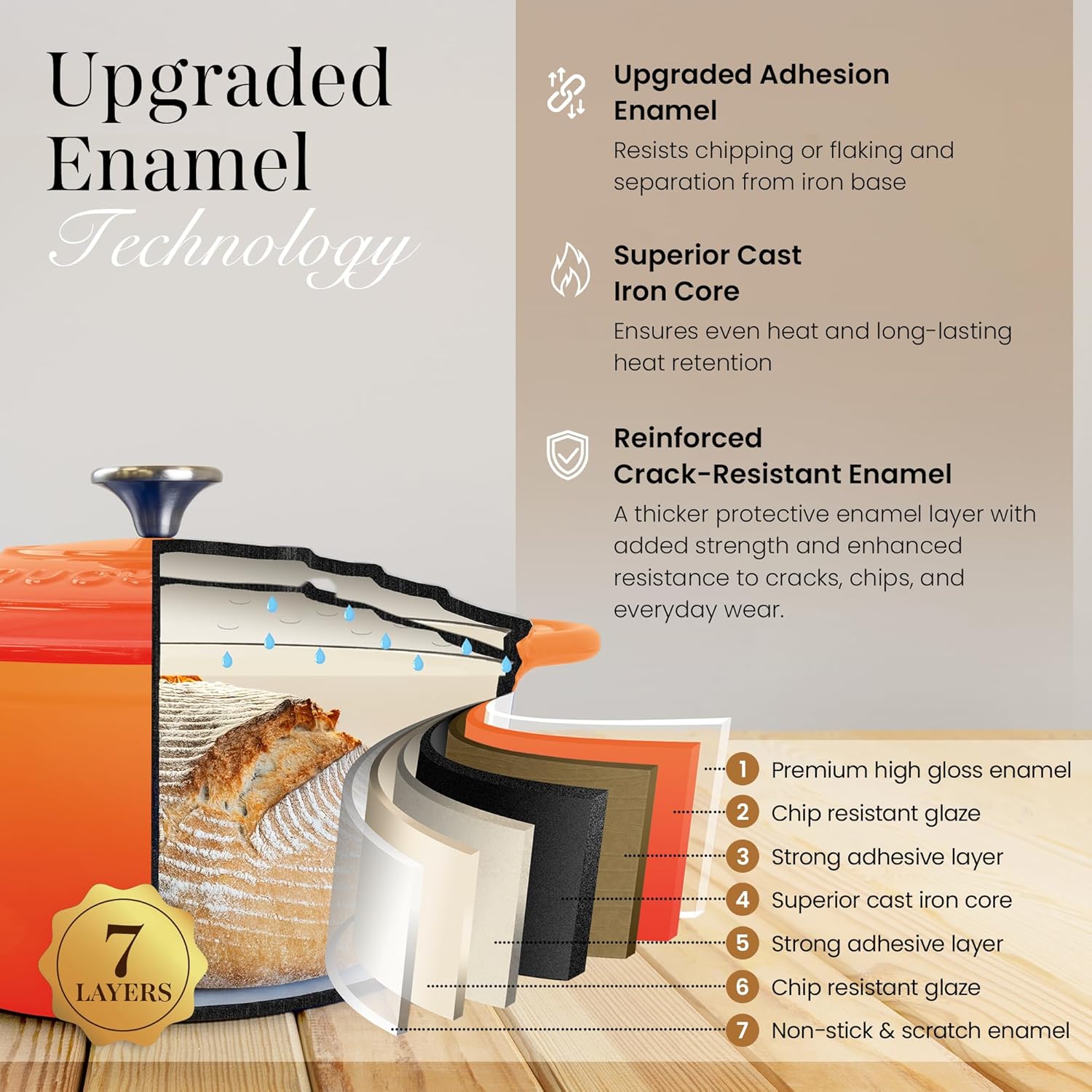 Nuovva Enamelled Cast Iron Dutch Oven Pot with Lid – 6.4 Quart Non Stick Casserole Pot – Heavy Duty & Oven Safe up to 500° F for Bread Baking, Braising, Stews, Roasting – 28cm Orange