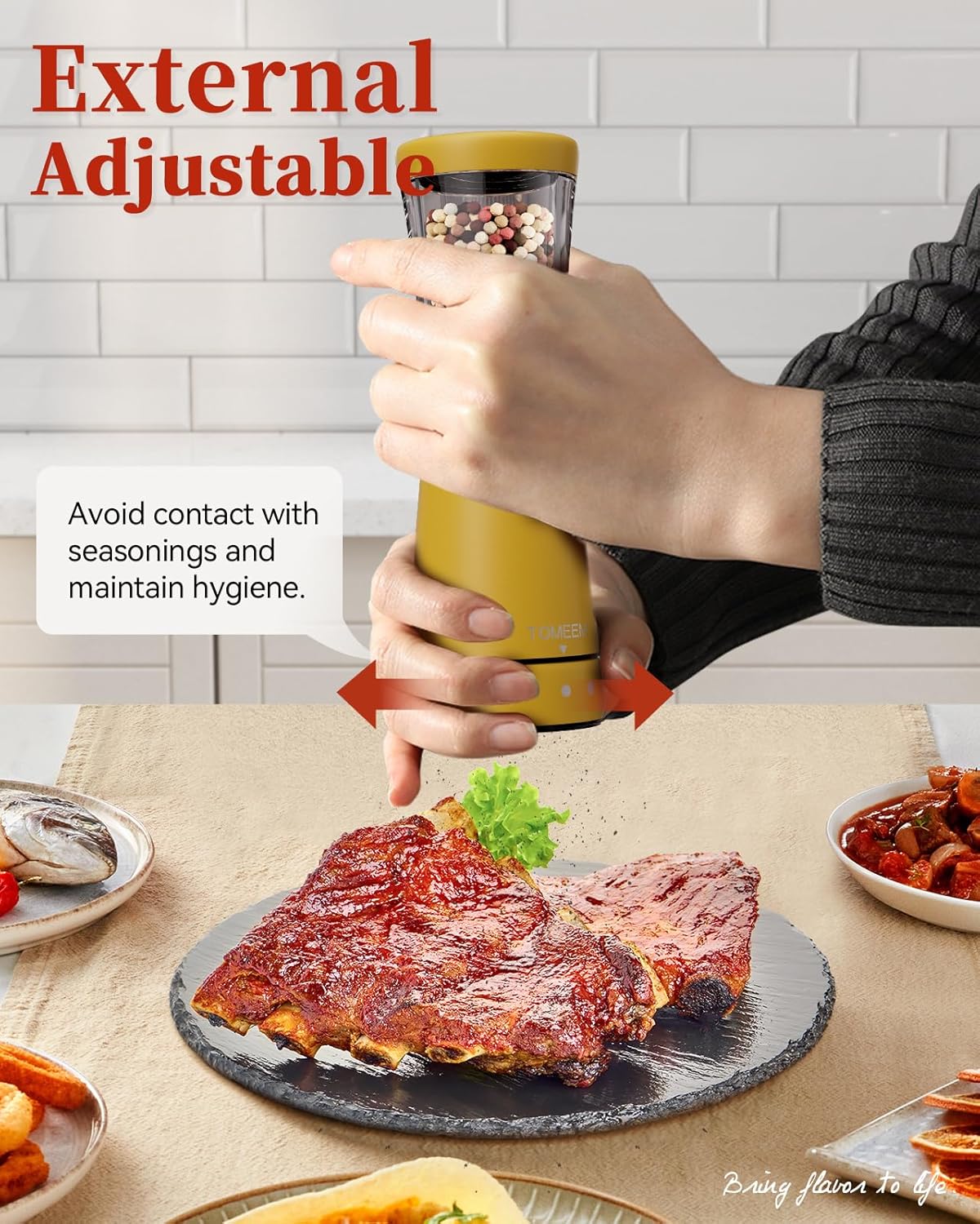 - Precision Grinding with Ease: Achieve the precise grind every time with the user-friendly adjustable coarseness feature. Simply twist the knob at the base to tailor your spices from fine to coarse