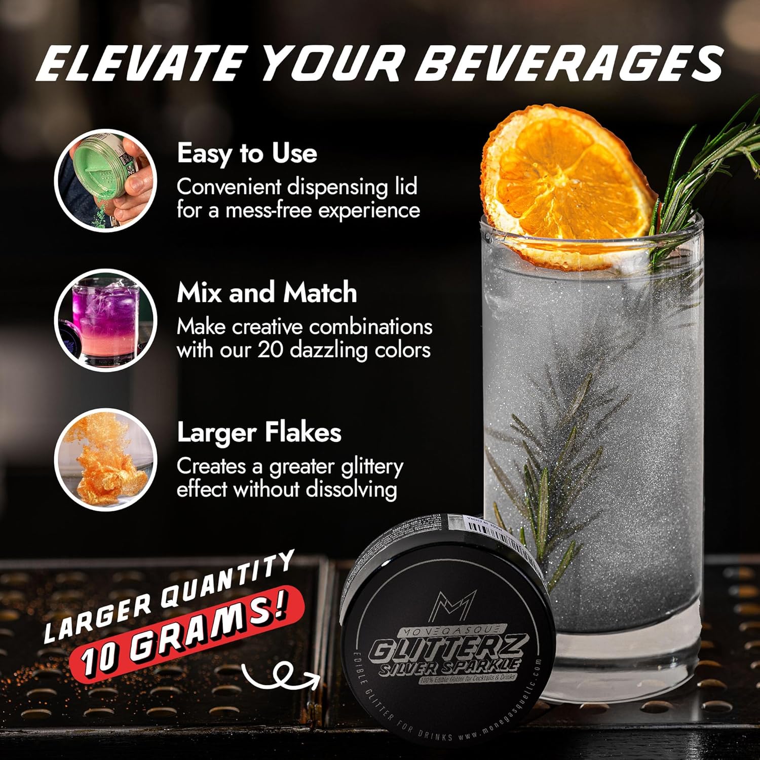 - VERSATILE, EASY, & MESS-FREE – Effortlessly enhance any dish or drink. Simply sprinkle MONÉGASQUE Glitterz onto halloween cocktails or desserts for a dazzling effect. With 20 vibrant colors, it's perfect for any event, keeping your creations stunningly fresh.
