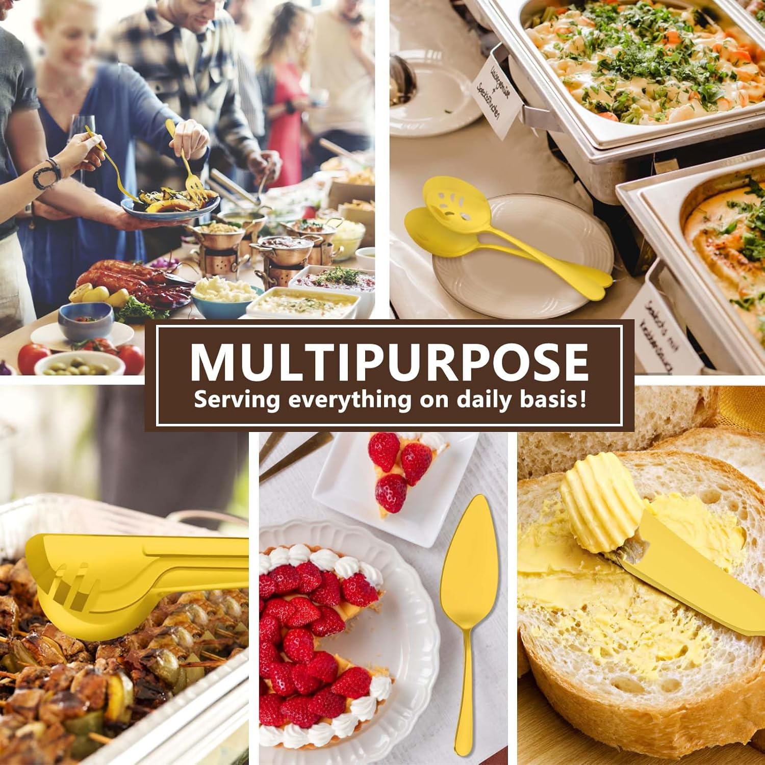 - 【Great Value 20 PCS Gold Serving Utensils】 BEWOS 20-Piece gold serving utensils set includes 4 large gold serving spoons, 4 slotted serving spoons, 4 serving forks, 4 serving tongs, 2 butter knife and 2 cake server. A variety of serving utensils can almost meet your daily and party needs, with much better quality than plastic utensils, affordable and reusable