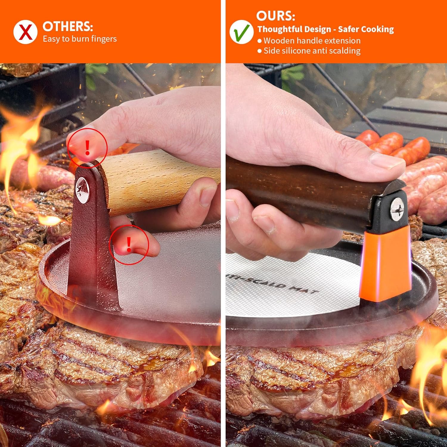 - 【Cool&Comfortable】: GGC smash burger press uses an upgraded wooden handle design. The classic and beautiful wooden handle feels comfortable to hold and prevents burns. The silicone covers on both sides of the burger press can effectively prevent burns caused by accidentally touching the edge of the burger maker during cooking. GGC burger press truly allows you to cook comfortably!