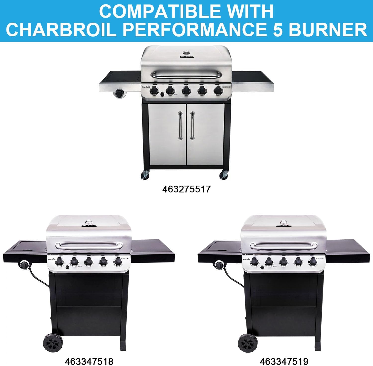 - Perfect for Charbroil Performance 5 Burner Grills: Inserts Griddle and Grill Grates for Charbroil Performance 5 Burner 463275517, 463275717, 463243518, 463243519. Compatible with Charbroil Performance Grills 463243518 463275517, 463243519 463275717.【Perfect for Charbroil Signature 3 Burners Grills】Compatible with Char-broil Signature 3 Burners Grills: 463348017, 463372017.【Note】When using our product with a matching upper for charbroil 3 burner grill, there is an extra piece of grate net that can be used as a spare grill net.