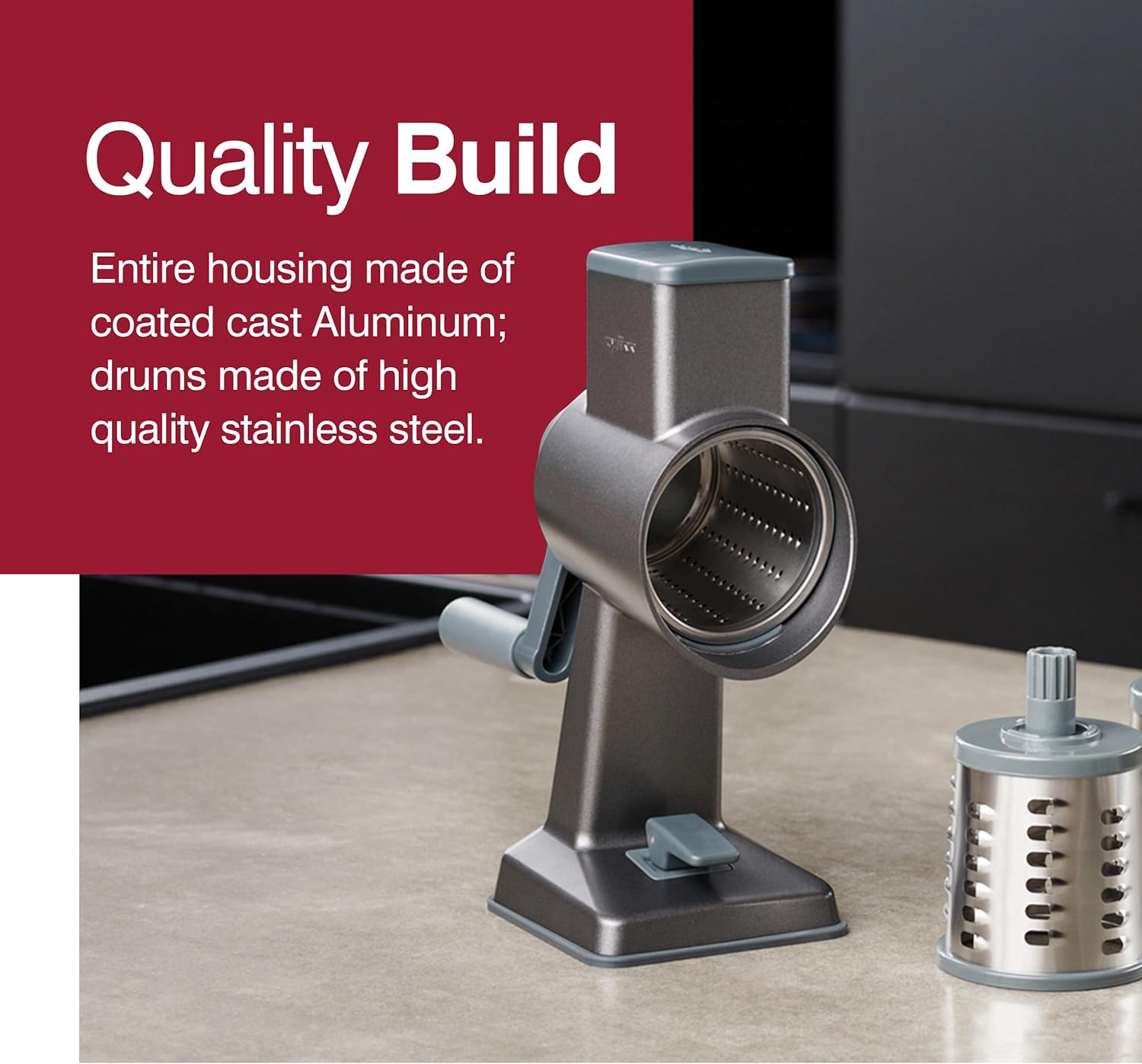 - Home & Kitchen Essential: The Gourmet Drum Grater is a versatile kitchen tool for efficiently grating, slicing and chopping various vegetables, fruit, cheese, nuts or chocolate