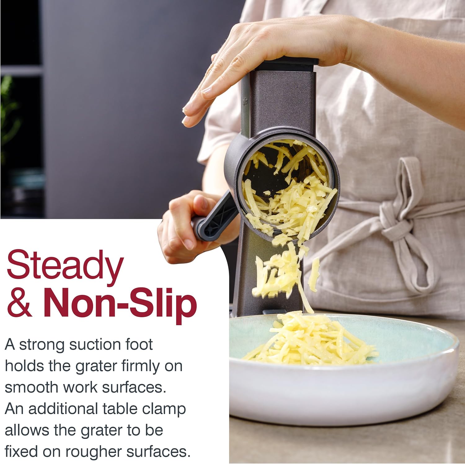 - Food Grater & Shredder: Includes Gourmet Drum Grater, plunger, table clamp, 3 drums (fine, coarse and cutting) and a drum storage tube; the suction foot holds the slicer on smooth surfaces while the table clamp fixes the grater on rough surfaces