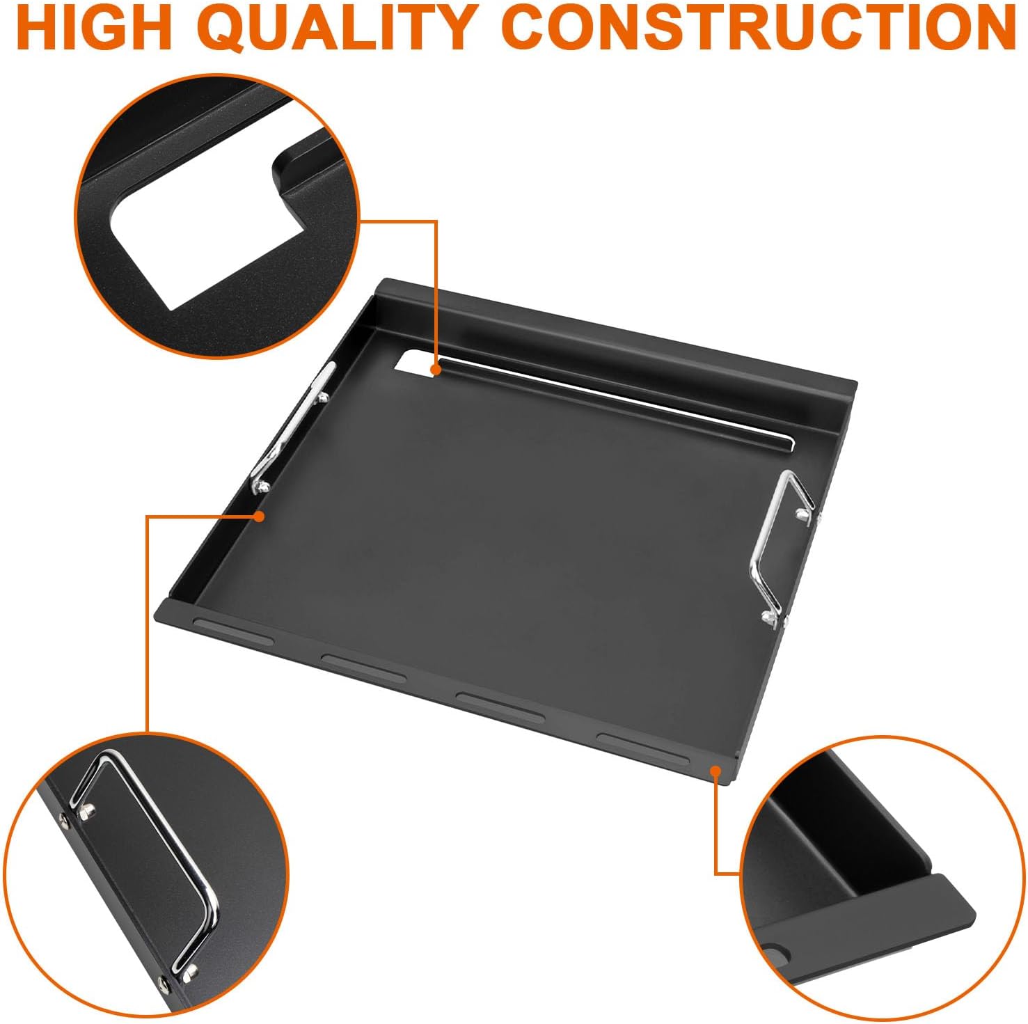 - 【Convenient Handles and Gloves】The coming with handles and gloves are handy for moving the griddle. The griddle insert measures 19.6 L x 17.4 W inches. Our full-size griddle insert, made of high-quality materials, is nonstick, more durable and heats up faster than other griddles.