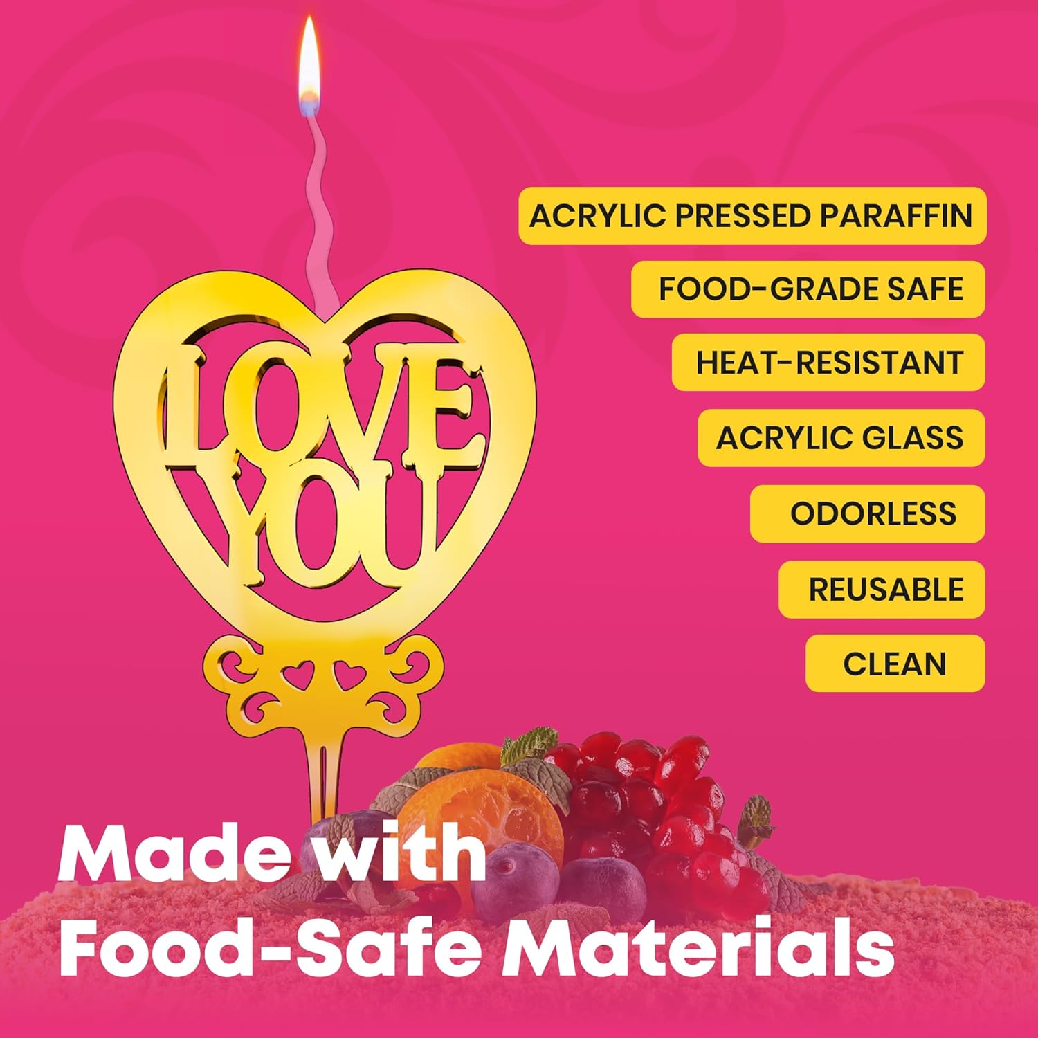 Love You Reusable Gold Romantic Cake Candle - Luxury Cake Topper Candle for Birthdays, Weddings & Anniversaries - Reusable Food Safe Acrylic, Shiny Mirror Finish - Happy Birthday Cake Topper Decor