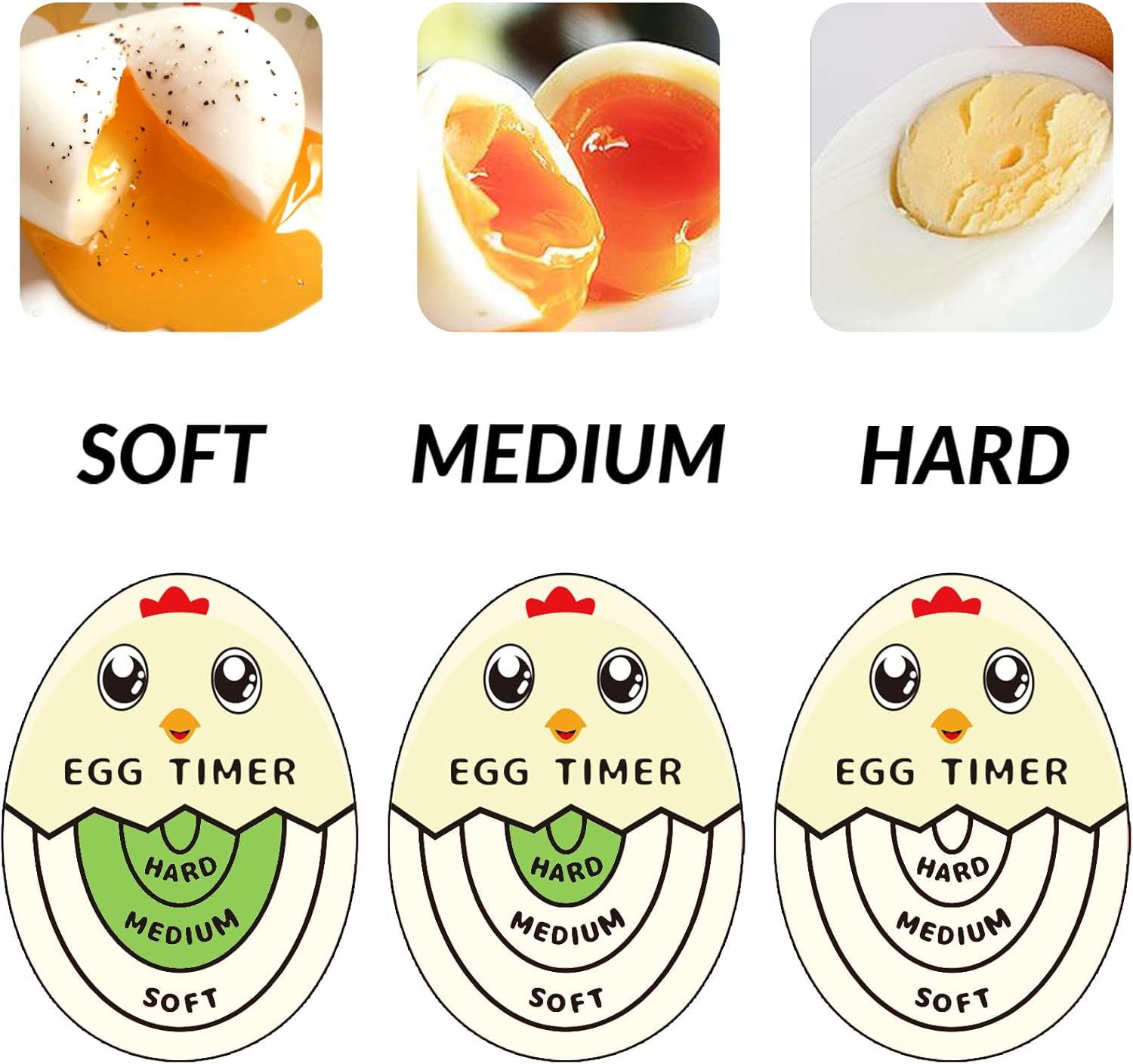 - No more guessing! You just put the boiled egg timer and eggs into the pot and wait. Soft, medium and hard boiled line on egg timer will tell you the doneness degree of eggs.