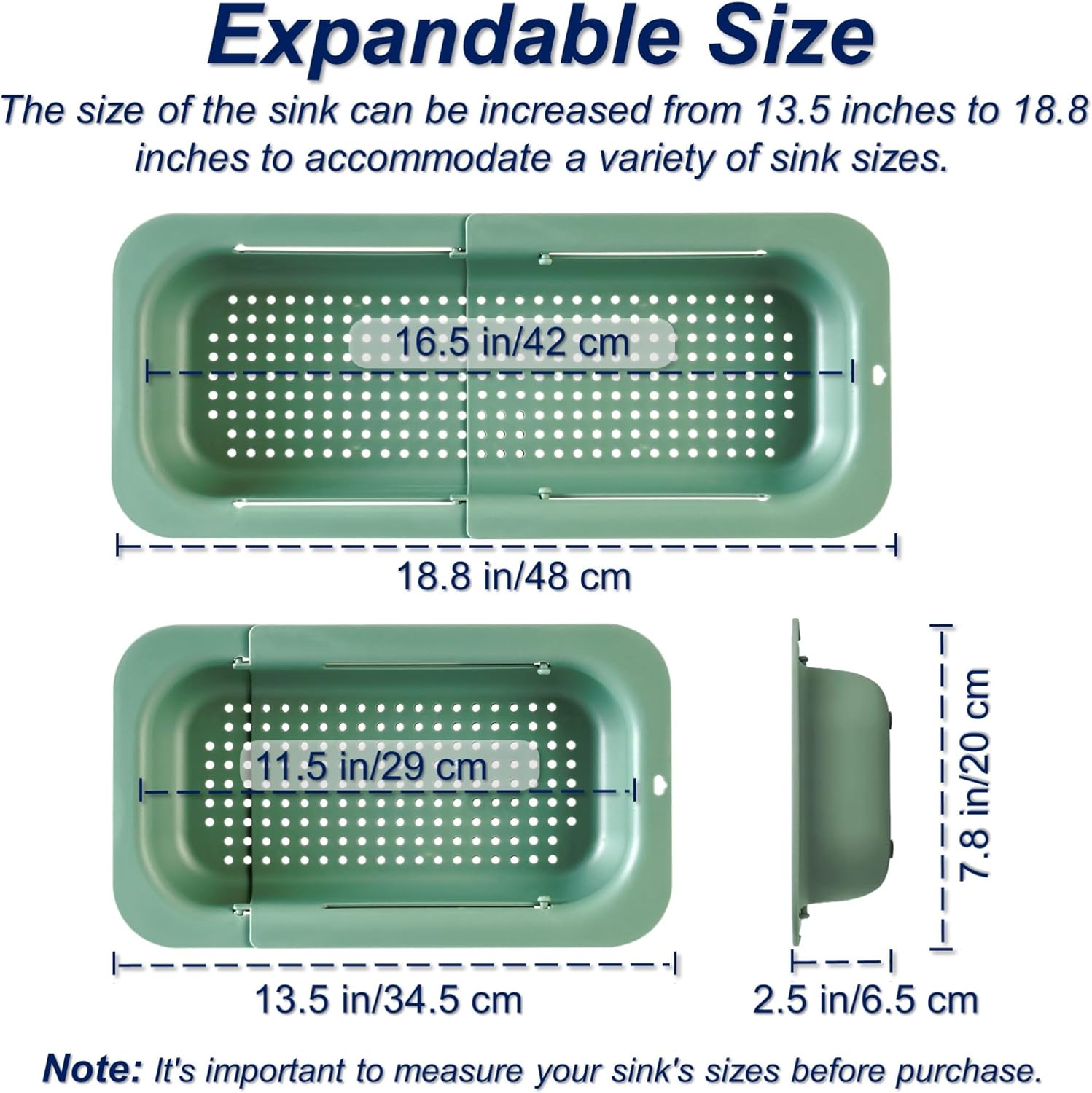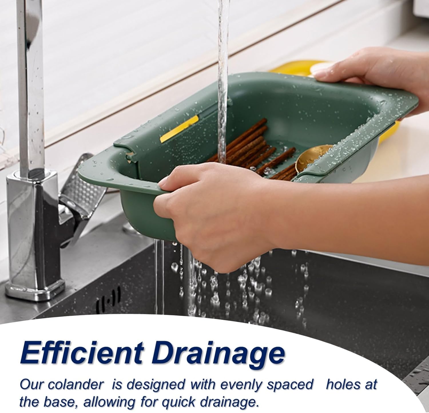 Extendable Sink Colander Strainer Basket - Wash Vegetables and Fruits, Drain Cooked Pasta and Dry Dishes - Adjustable Over the Sink Colander Collapsible Drainer Basket - Green