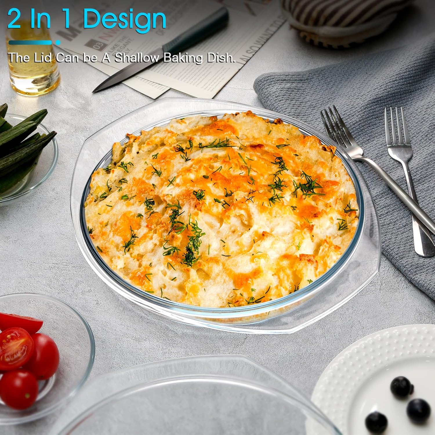 - 【2 In 1 Design】The lid can be used instead of foil and turned over and used for shallow dishes. The glass lid allows you to easily monitor your food while it cooks, locking in flavors and moisture for delicious results every time. Whether you're cooking for yourself or hosting a dinner party, this casserole dish is both stylish and practical.