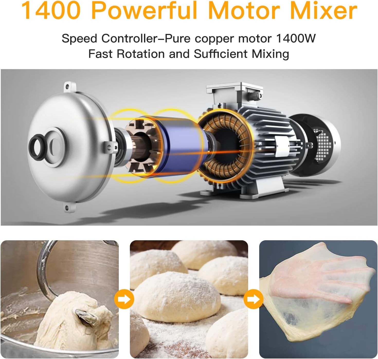 - 10-Speed Options: The dough mixer offers 10 speeds to suit various mixing tasks. Use 1-3 speeds for dough hook (perfect for heavy mixtures like bread and pizza), 4-7 speeds for the beater (ideal for medium-heavy mixtures like salads and cookies), and 8-10 speeds for the whisk (great for light mixtures like cream, eggs, cakes, and sauces)