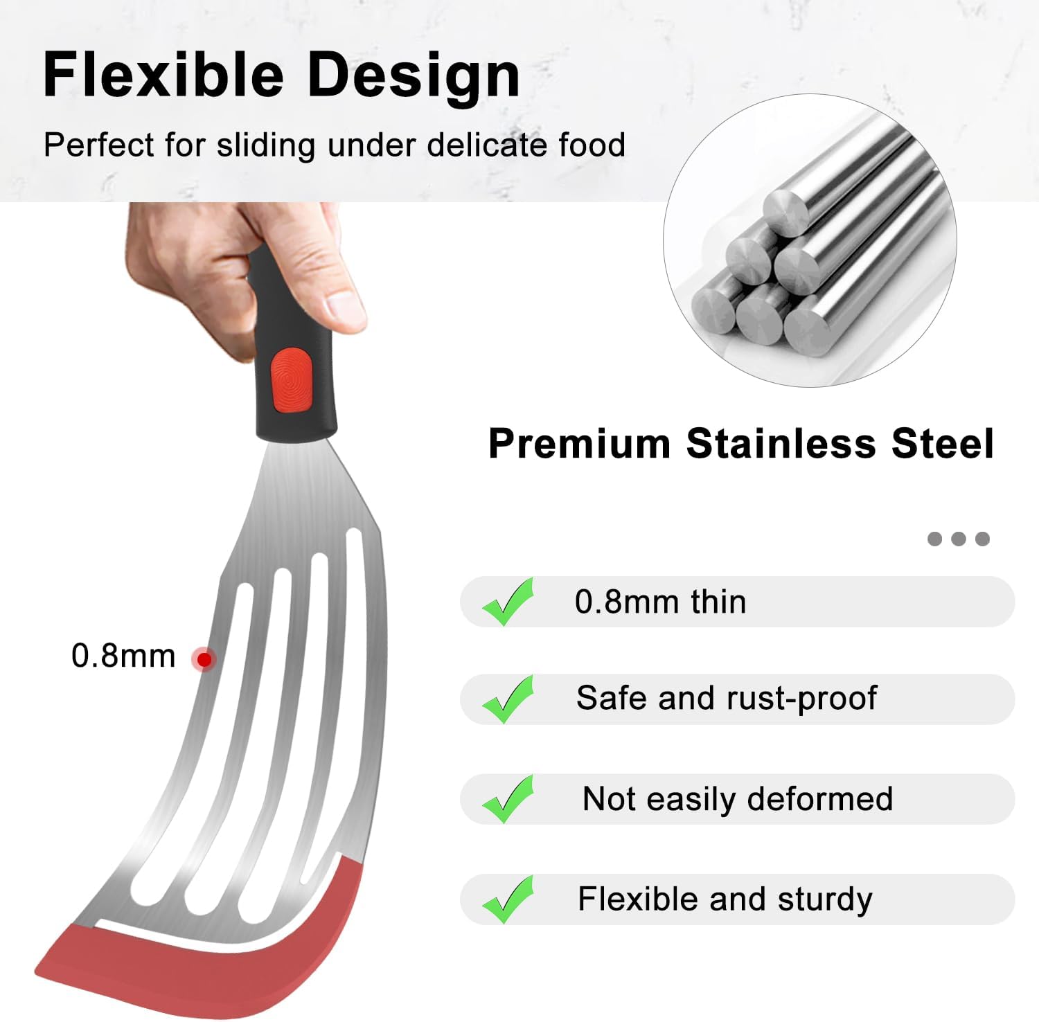 - Flexible and Sturdy: The fish spatula stainless steel blade is 0.8 mm thin, with a beveled edges for easy to slide beneath food. and is strong enough to easily lift and flip heavy food. Slotted spatulas designed to drain excess oil and grease