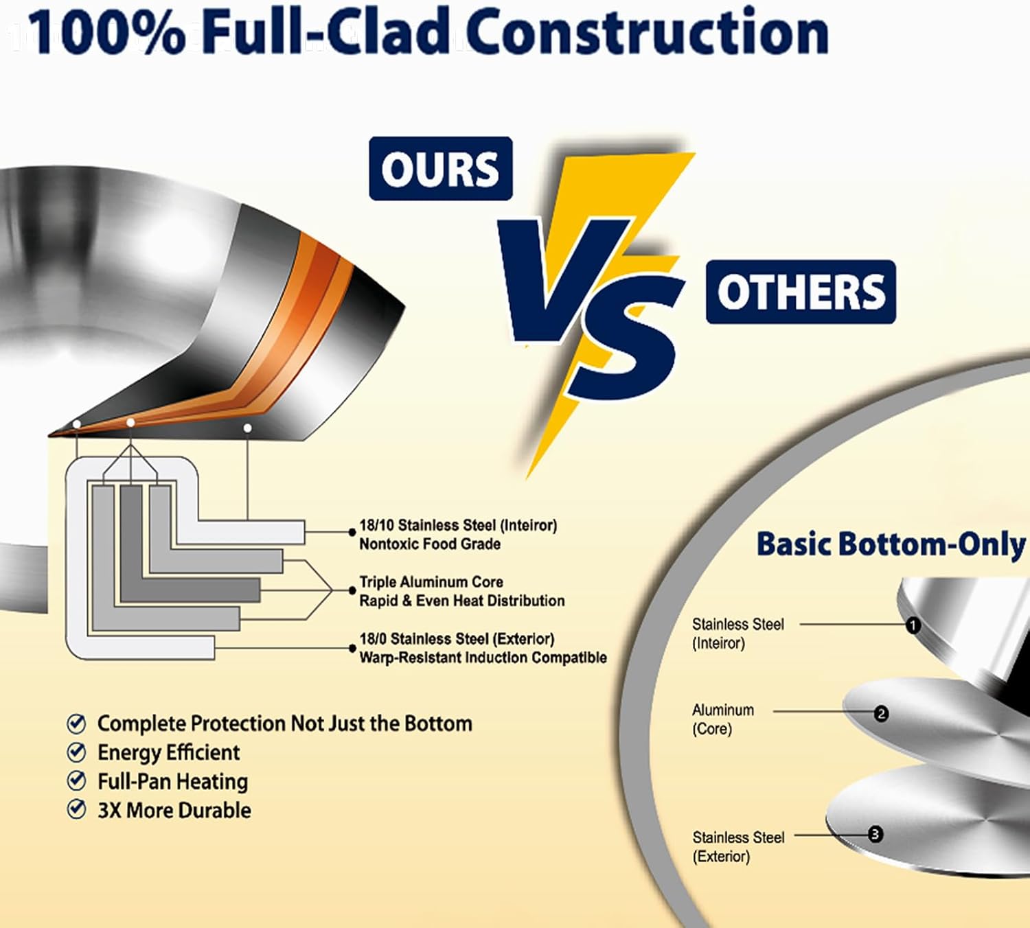 - The Delarlo Fully Clad Triply Stainless Steel 8 Quart Pot with Lid Consists of Three Layers Materials. The Inner Layer is 18/10 Stainless Steel, the Middle Layer is Aluminum, and the Outer Layer is 18/0 Stainless Steel. The Substantial 2.3mm Material Makes the 8 QT Pot Not Only Durable and Heavy Duty, But also Enables The Cooking pots Body to Withstand a High Temperature Up to 650℉, and The Lid 300℉