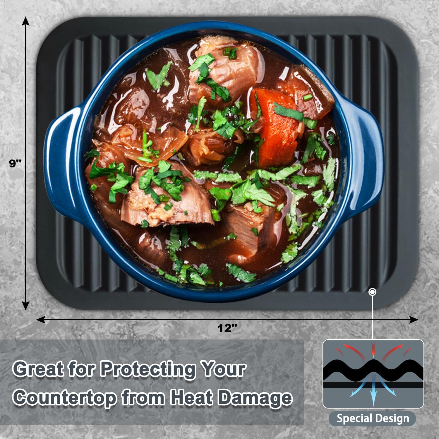 - EASY TO CLEAN UP & STORE: Walfos silicone mats for kitchen counter are hand washable and can be just thrown in the dishwasher. Almost anything can be easily washed off the non-stick surface and dried quickly. Can be rolled up or hung on a hook for storage to save space. Thick Trivet Size: 16'' x 12'' x 0.22''; 12'' x 9" x 0.22''; 7"x7"x0.27"; 7.1"x7.1"x0.24"