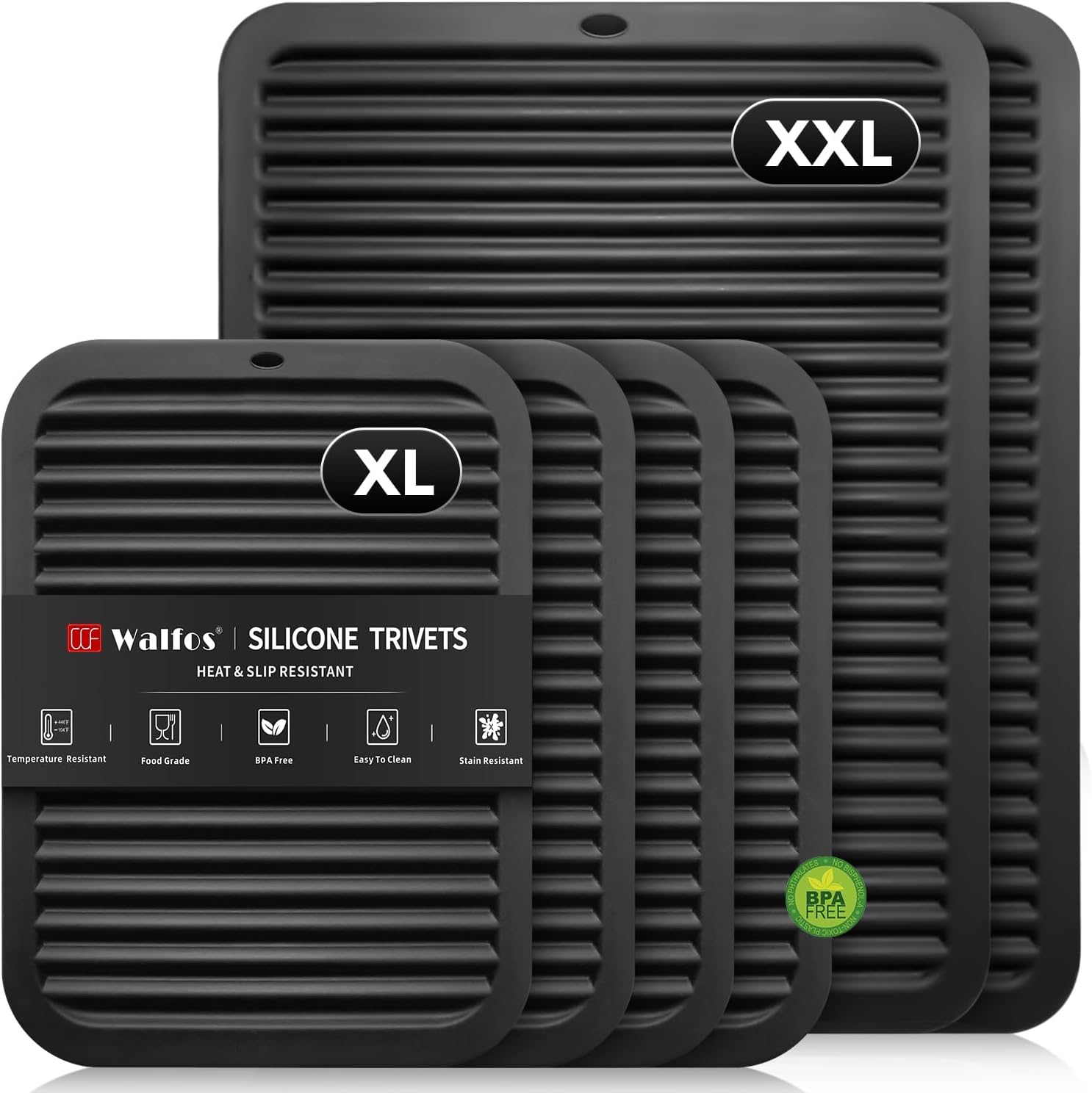 - SILICONE TRIVET SET: Walfos extra large trivet and normal size trivet set allow you to accomplish most insulation tasks, from large hot dishes, hot pots, appliances to normal hot pots and pans, hot plates etc., better protect your countertops from heat damage. Made from food-grade silicone, Walfos pot holders are BPA-free and will not attract odors, stain, rust or crack
