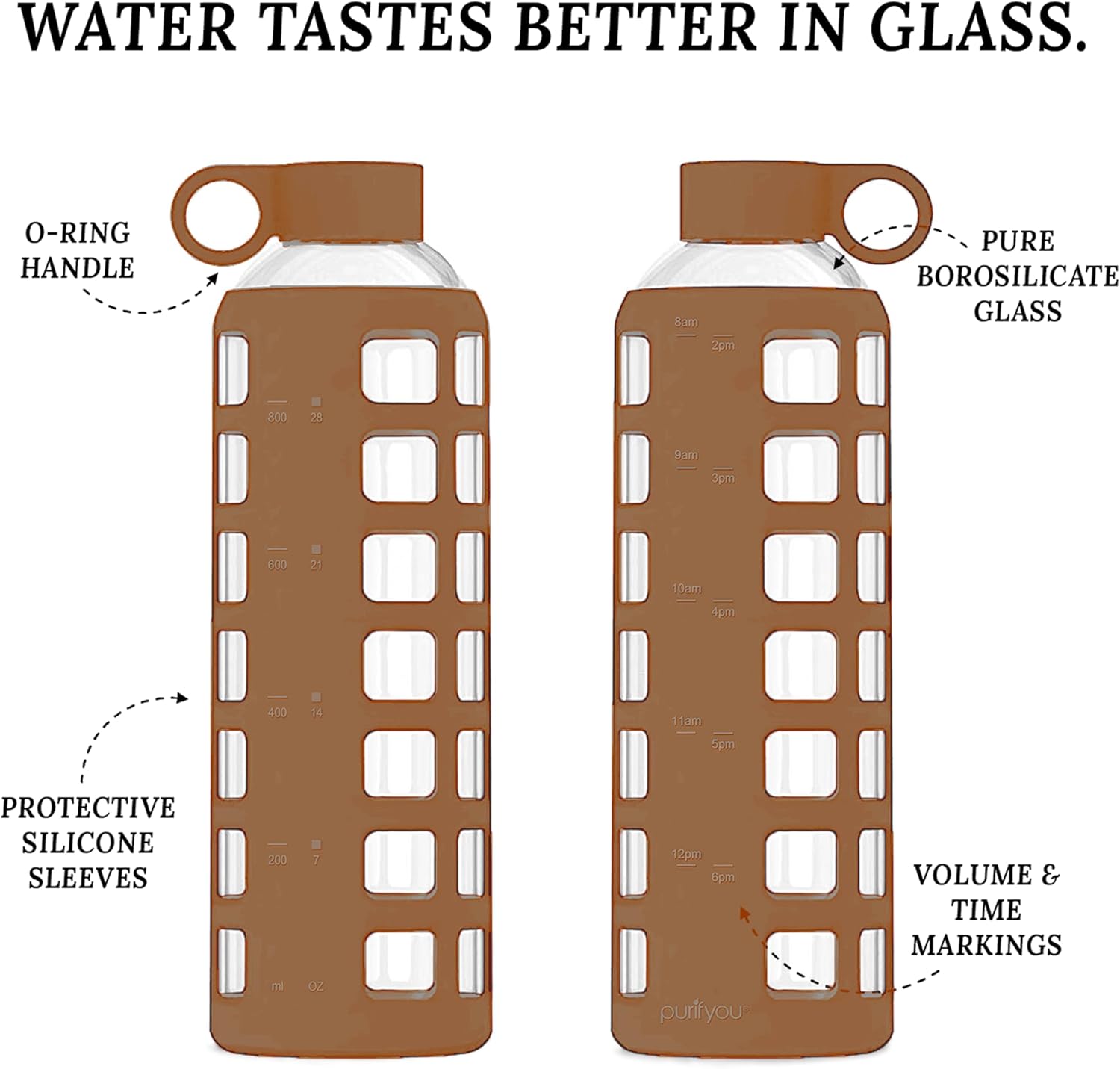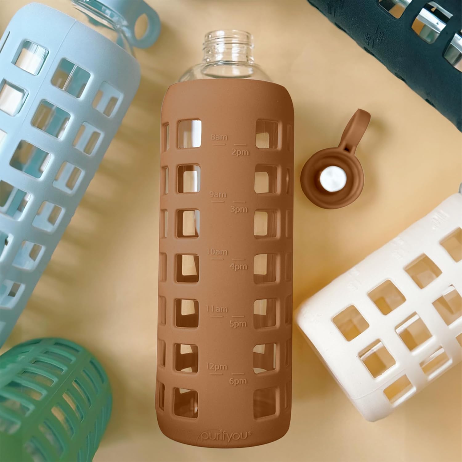 purifyou 40oz / 32oz / 22oz / 12oz Borosilicate Glass Water Bottle with Time & Volume Markers, Silicone Sleeve, Stainless Steel Lid – Reusable Glass Bottle for Water & Juice (40oz Iced Coffee)