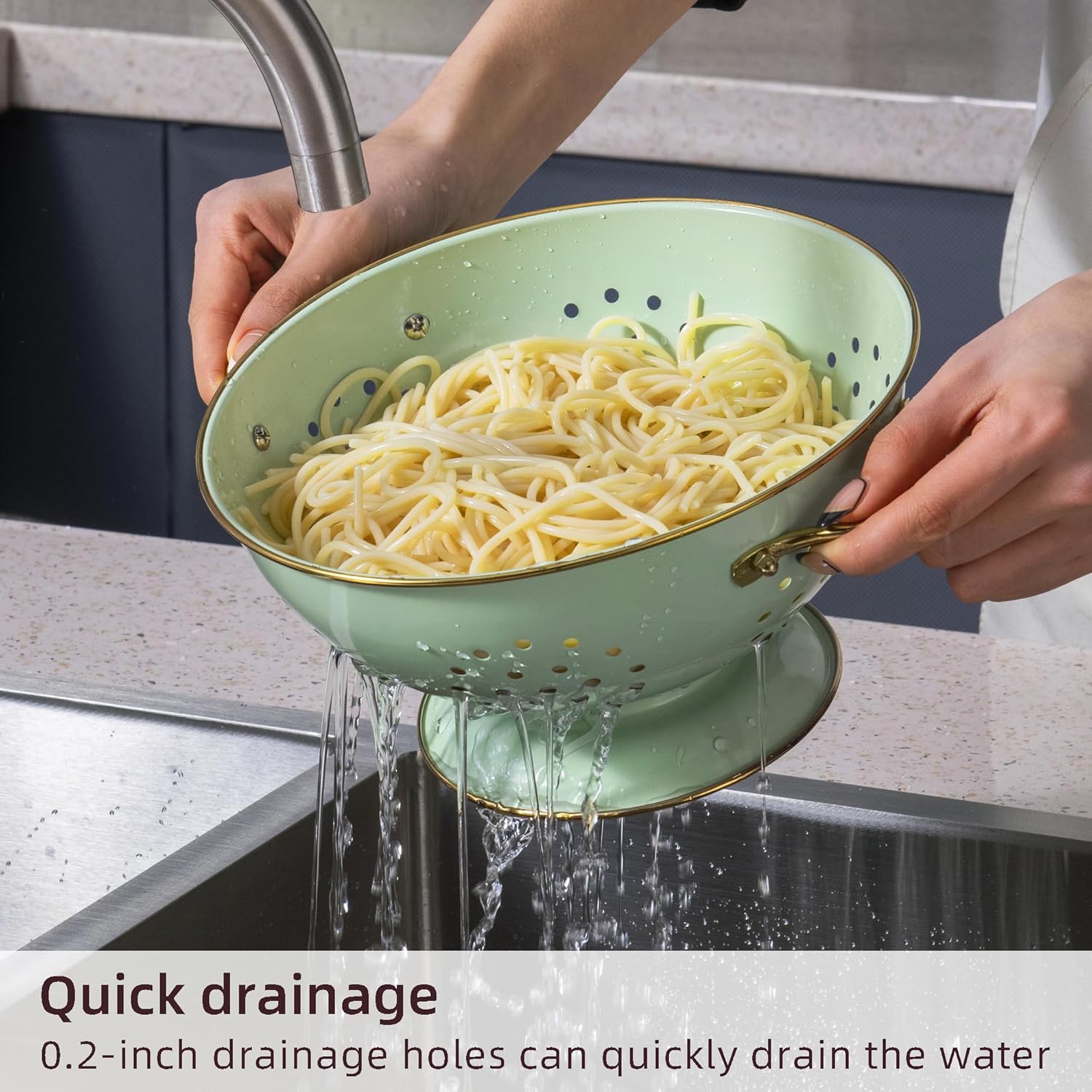 Metal Colander Set of 3, Strainer Basket with Handles perfect for Spaghetti, Pasta, Berry, Vegetable, Fruit, Solid Base Powder Coated Kitchen Essential Strainer Set, 1 & 3.5 & 5 Qt (Green)
