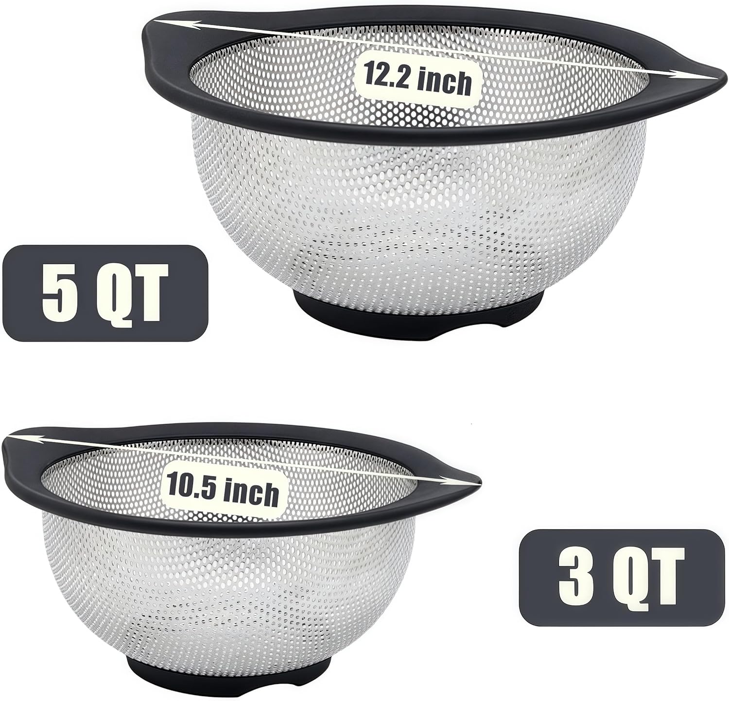 Stainless Steel Colander for Kitchen Metal Colanders & Food Strainers, Small and Large Sink Colander Set, Black Non-Slip Grip, (3 QT and 5 QT)