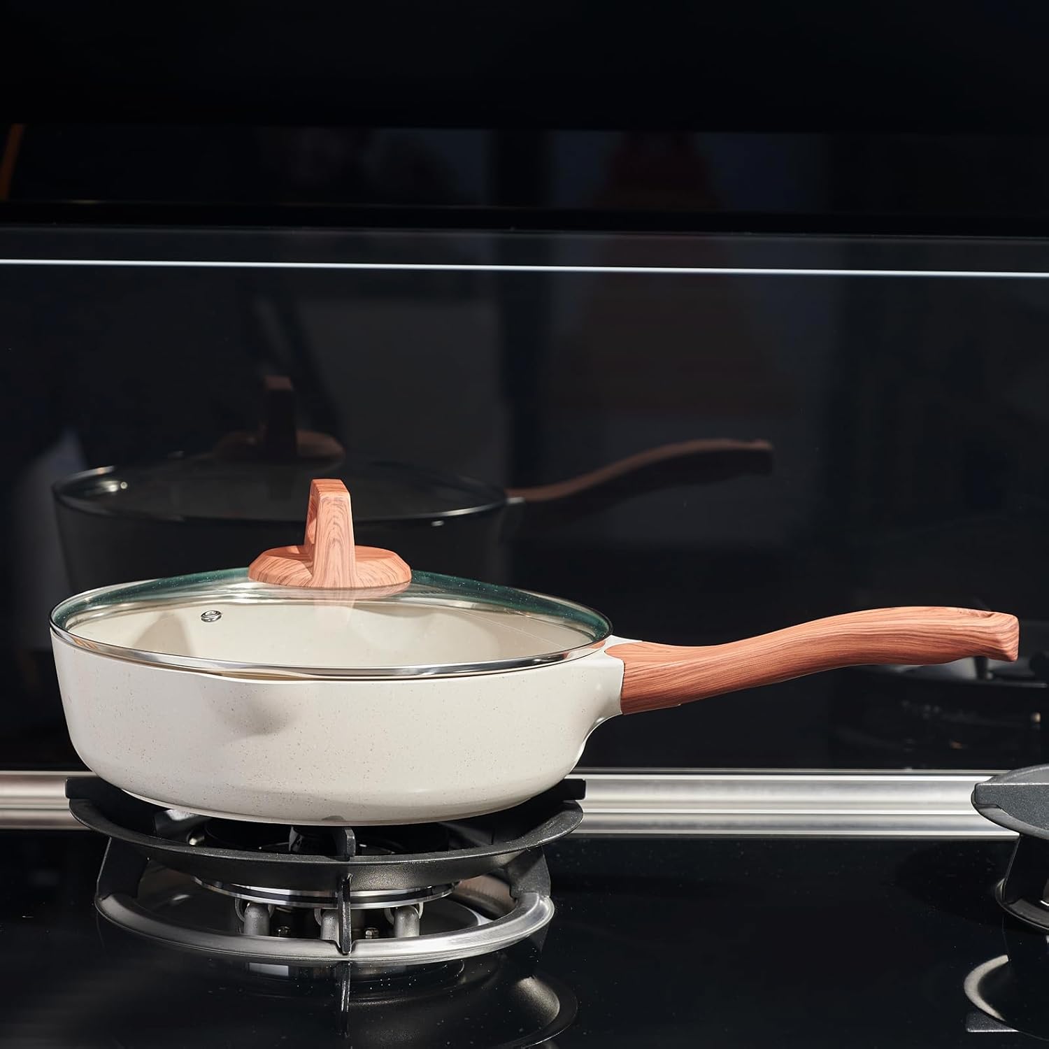 - 【Easy to Clean & Eco-friendly】Also, you'll be able to cook healthier meals for your family since you won't have to use as much oil. Clean up is a breeze, just wipe it with a rag or rinse with water. Dishwasher safe,hand washing recommended to preserve the nonstick. The nonstick surface makes cooking with little oil for healthy diet, the pan can help you solve stick and difficult to clear problem. CO2 emissions can be reduced. This frying pans for stove top is ECO Friendly.