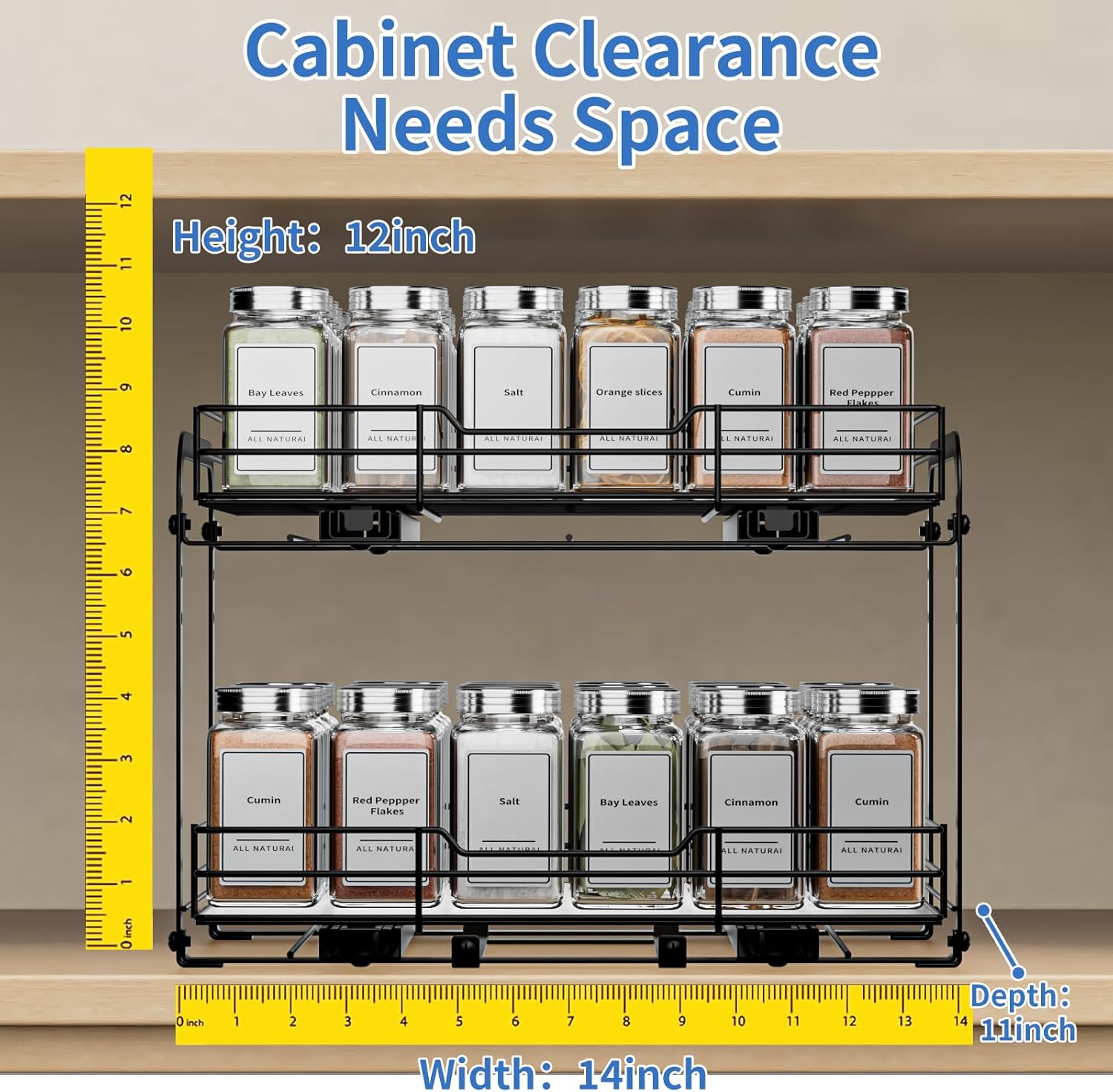 - Fits for Standard Cabinet: Our seasoning organzier measures at 13.5 ''W x 10.5''D x 9.5''H. Your cabinet space is at least 14"W x 11 "D x 12''H for installation and use. Please confirm your cabinet size before you order. The 2 tier vertical spice rack design saves valuable cabinet space. NOTE: The spices organizer holds up to 60 standard spice jars.