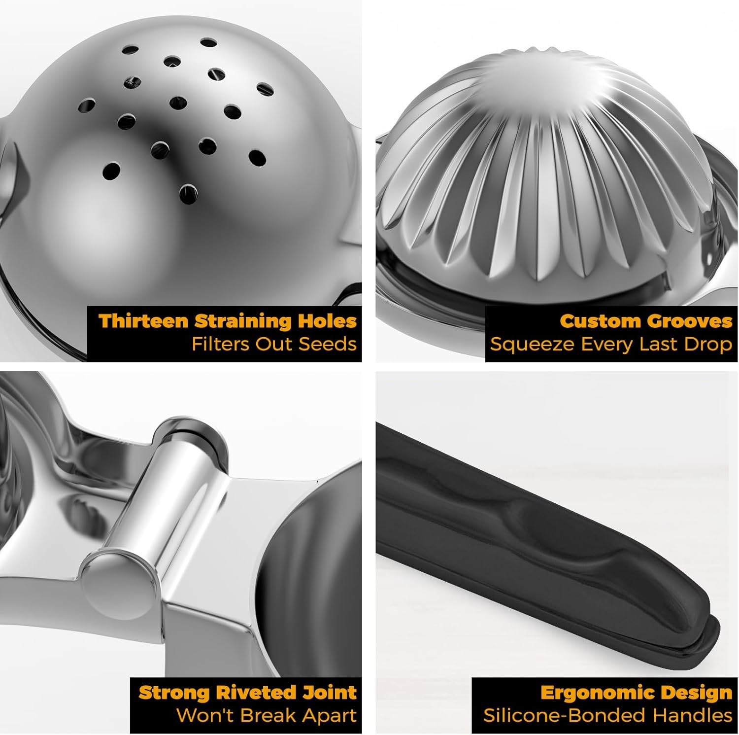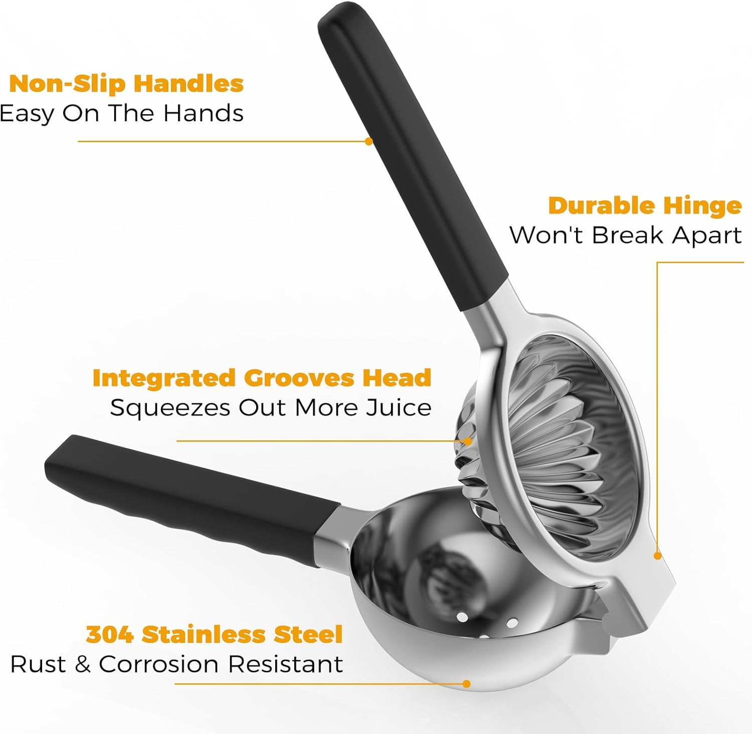 Stainless Steel Lemon Squeezer - Metal Citrus Juicer - Lime Lemon and Fruit Juicer with Silicone Handles - Large Manual Citrus Press Juicer - Hand Held Squeezer - Ergonomic Design with Solid