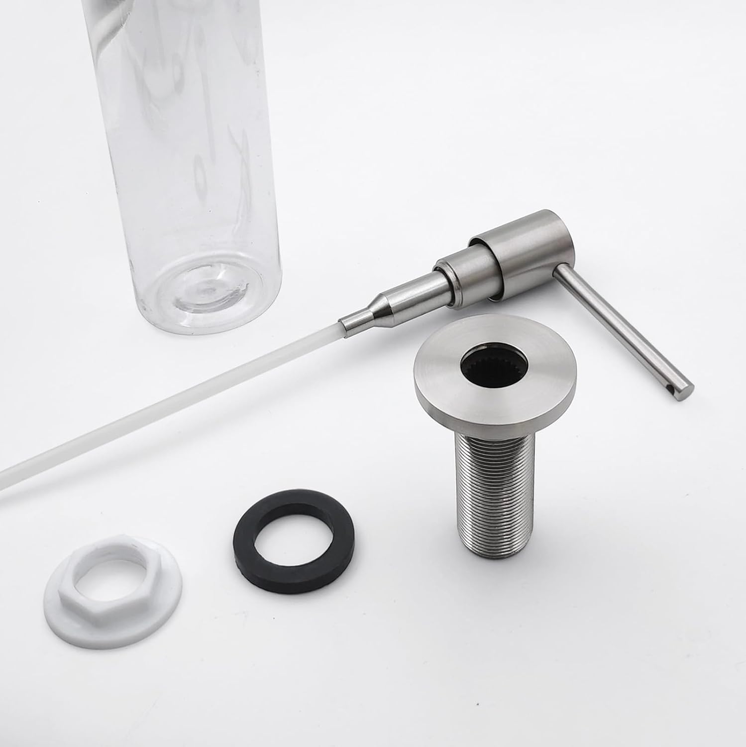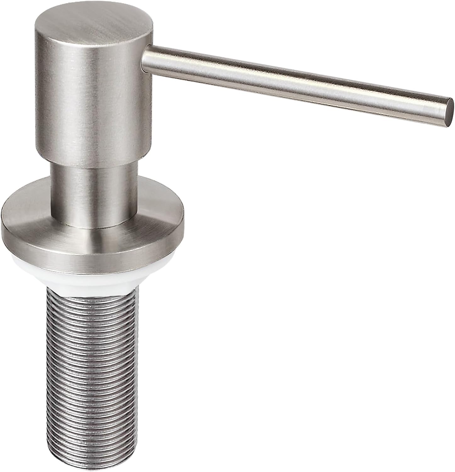 - ️Built To Last:Sturdy built in sink soap dispenser for kitchen sink,pump head, pump core and threaded tube are made with solid brass, equiped with corrosion resistant spring. It comes with a 17 OZ large plastic bottle. SOLID BRASS CONSTRUCTION brushed nickel rust resistant finish that will not tarnish as time goes on. The heavy soap dispenser pump mechanism is designed for long lasting excellent performance to dispense consistently with each and every press. Matching perfectly with most faucet models from different brands.