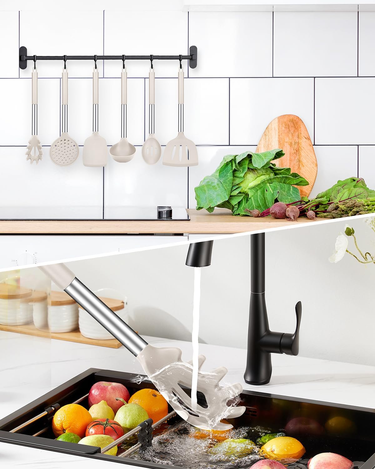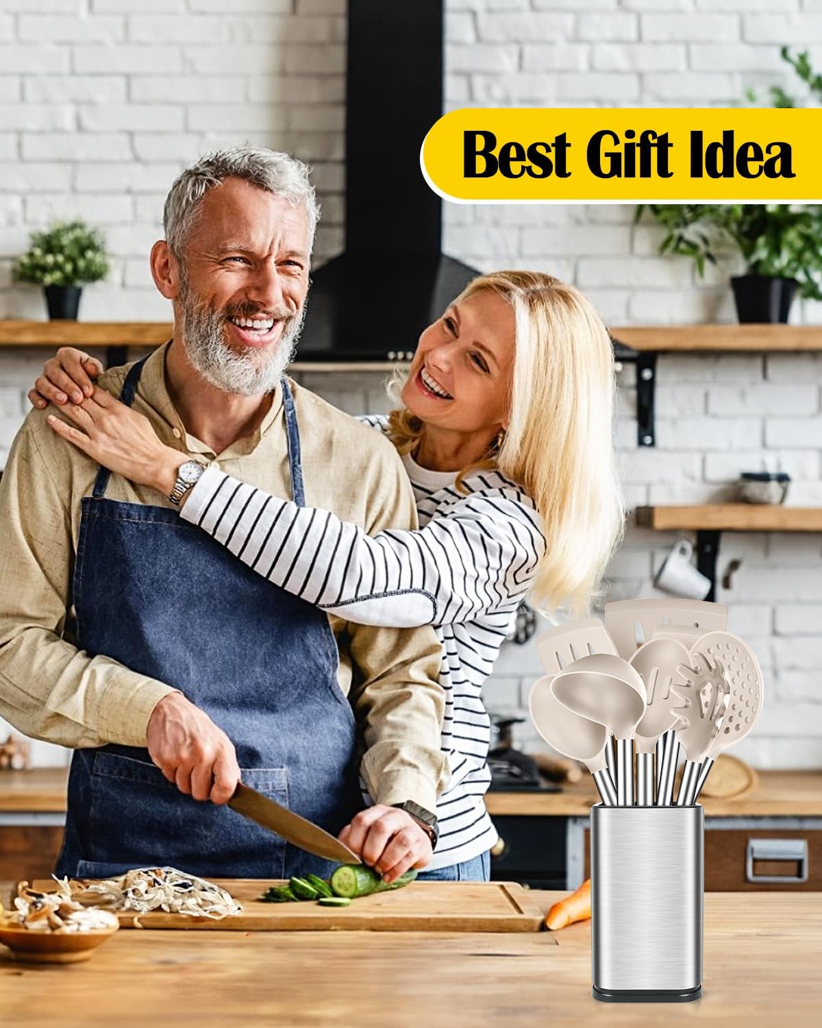 Silicone Cooking Utensil Set, 8Pcs Non-stick Cookwares with Stainless Steel Handle, BPA Free Heat Resistant Kitchen Tools with Spatulas, Turners, Spoons, Skimmer and Pasta Fork (KHAKI)
