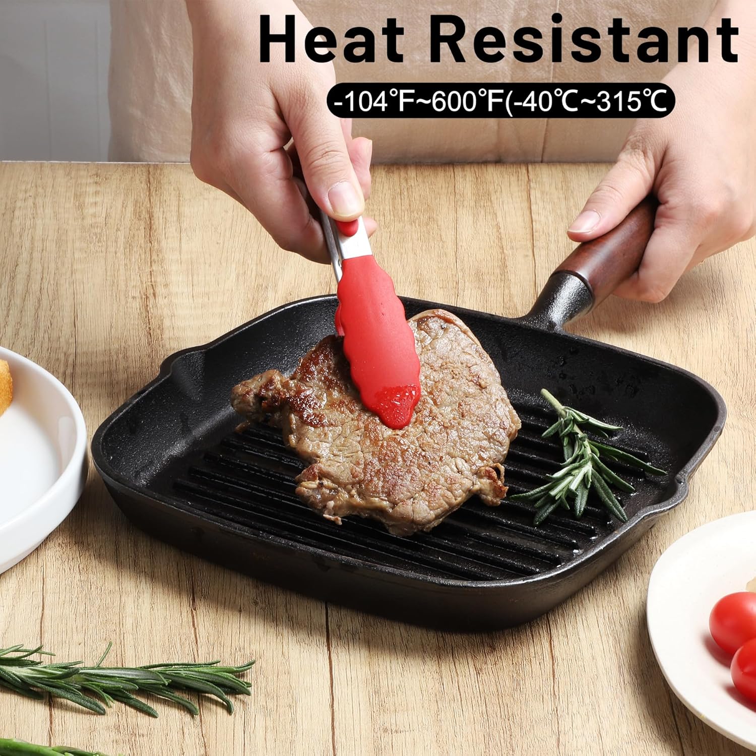 - EASY TO USE: The cooking tongs' handle is cushioned with silicon, good for thumb rest and ensures good grip and control. The Food Grade silicon tongs tip is heat resistance 600Β°F and less prone to scratch the pan. Easy to rinse, dishwasher safe.