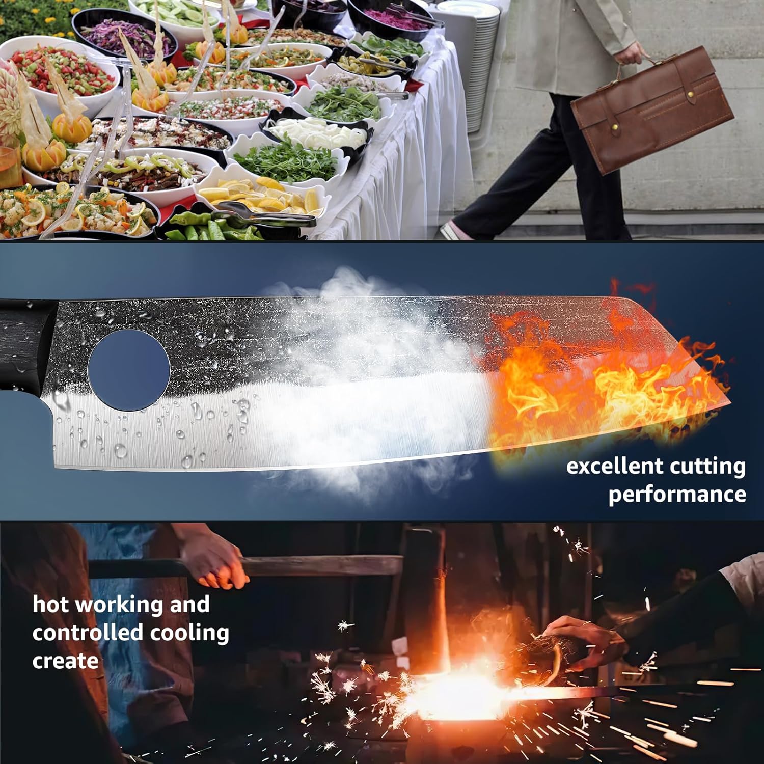 - High Carbon Forged Knife Set: This chef's knife set features blades constructed from an enhanced version of hand-forged high carbon steel. Meticulously hand-hammered to create a distinctive hammered texture, the blades exhibit heightened hardness and toughness. With their precisely honed 16Β°V-shape sharpening, these blades minimize cutting resistance, while the meticulously hand-ground open edges ensure exceptional sharpness, enabling effortless and precise slicing of food.