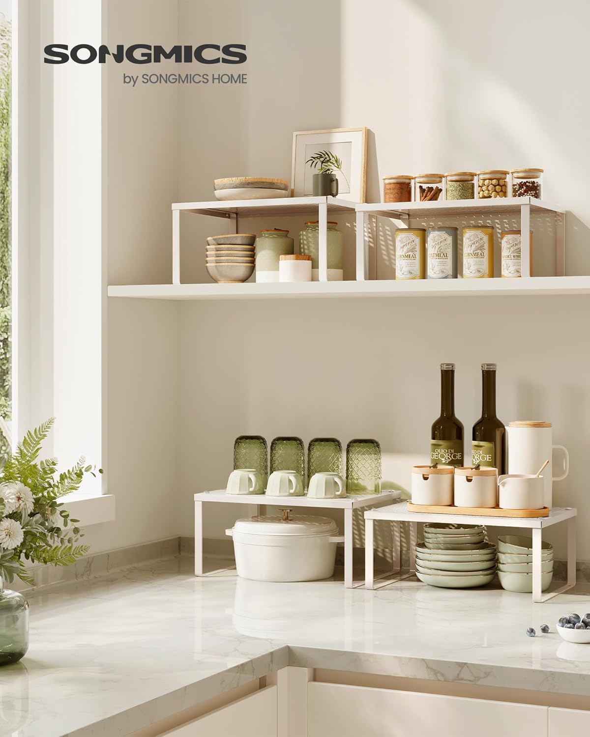 SONGMICS Spice Racks, Set of 4 Metal Cabinet Shelf Organizers, Countertop Organizers, Shelf Risers, Stackable, Expandable, Oatmeal Beige UKCS006K01