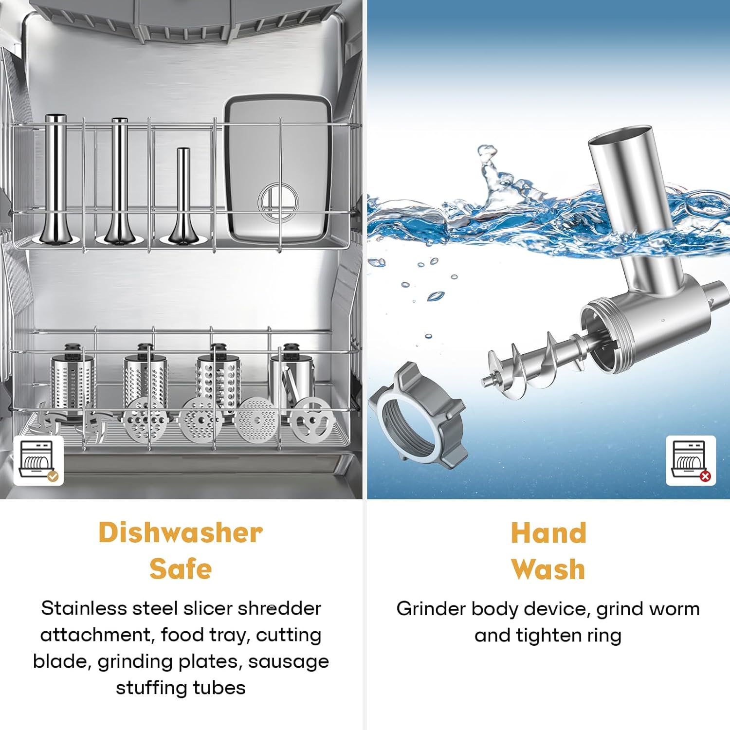 - Easy to Clean and Support: For kitchenaid mixer attachments only the slicer shredder attachments are dishwasher safe. The meat grinder attachmnet recommend washing by hand, cleaning it with soap, warm water (shall not exceed 122 β). The provided cleaning brush can clean any hidden crevices or corners. If you have any questions about the product, please contact us.