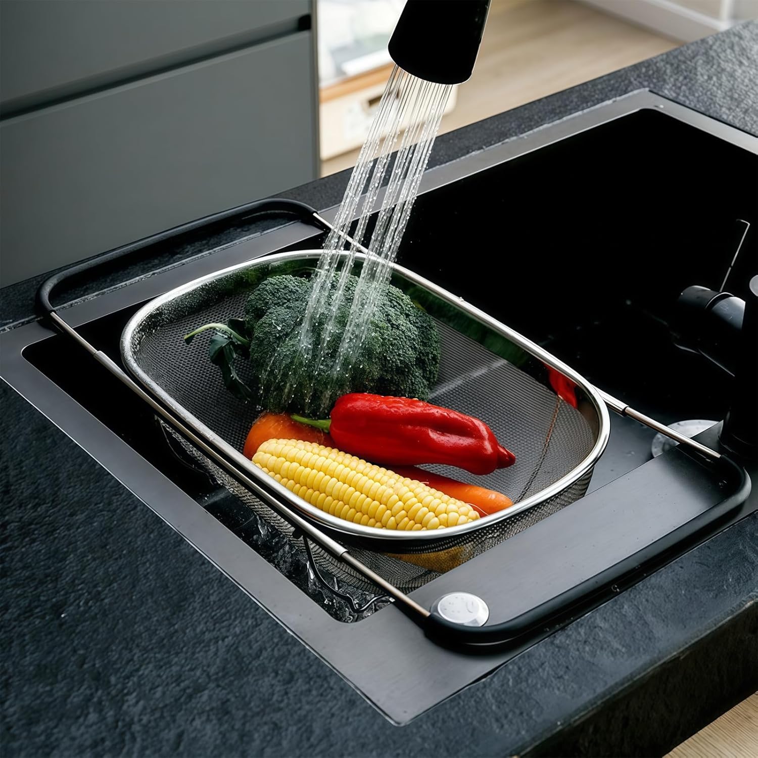 Over The Sink Colander 6 Quart Stainless Steel Fine Mesh Strainer Basket & Expandable Rubber Grip Handles - Strain, Drain, Rinse Fruits, Vegetables